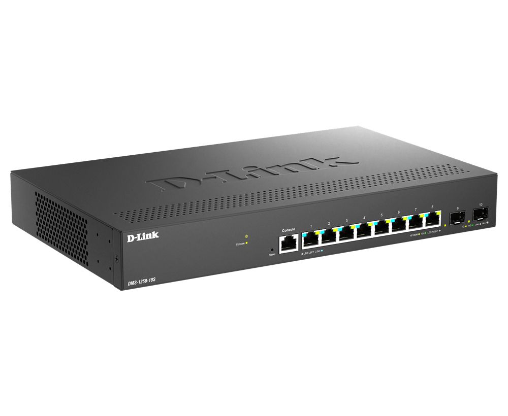 D-Link DMS-1250-10S. Tipo interruttore: Gestito. Tipo di porte RJ-45: 2.5G Ethernet (100/1000/2500), Quantità di porte RJ-45: 8. Dimensioni tavola MAC: 16000 voci, Capacità di commutazione: 80 Gbit/s. Standard di rete: IEEE 802.3ab, IEEE 802.3ae, IEEE 802.3af, IEEE 802.3an, IEEE 802.3at, IEEE 802.3az, IEEE 802.3bt,.... Connettore di alimentazione: Jack di ingresso AC. Montaggio rack