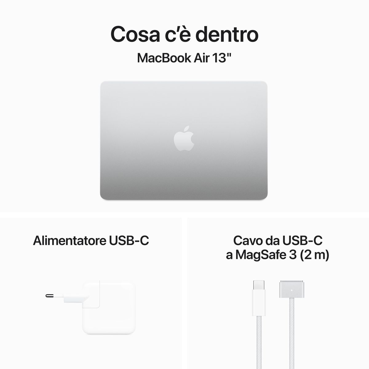 Apple MacBook Air 13": Chip M3 con CPU 8-core e GPU 10-core, 512GB SSD - Argento. Tipo di prodotto: Computer portatile, Fattore di forma: Clamshell. Famiglia processore: Apple M, Modello del processore: M3. Dimensioni diagonale schermo: 34,5 cm (13.6"), Risoluzione del display: 2560 x 1664 Pixel. RAM installata: 24 GB. Capacità totale di archiviazione: 512 GB, Supporto di memoria: SSD. Modello scheda grafica integrata: Apple GPU. Sistema operativo incluso: macOS Sequoia. Colore del prodotto: Argento. Peso: 1,24 kg