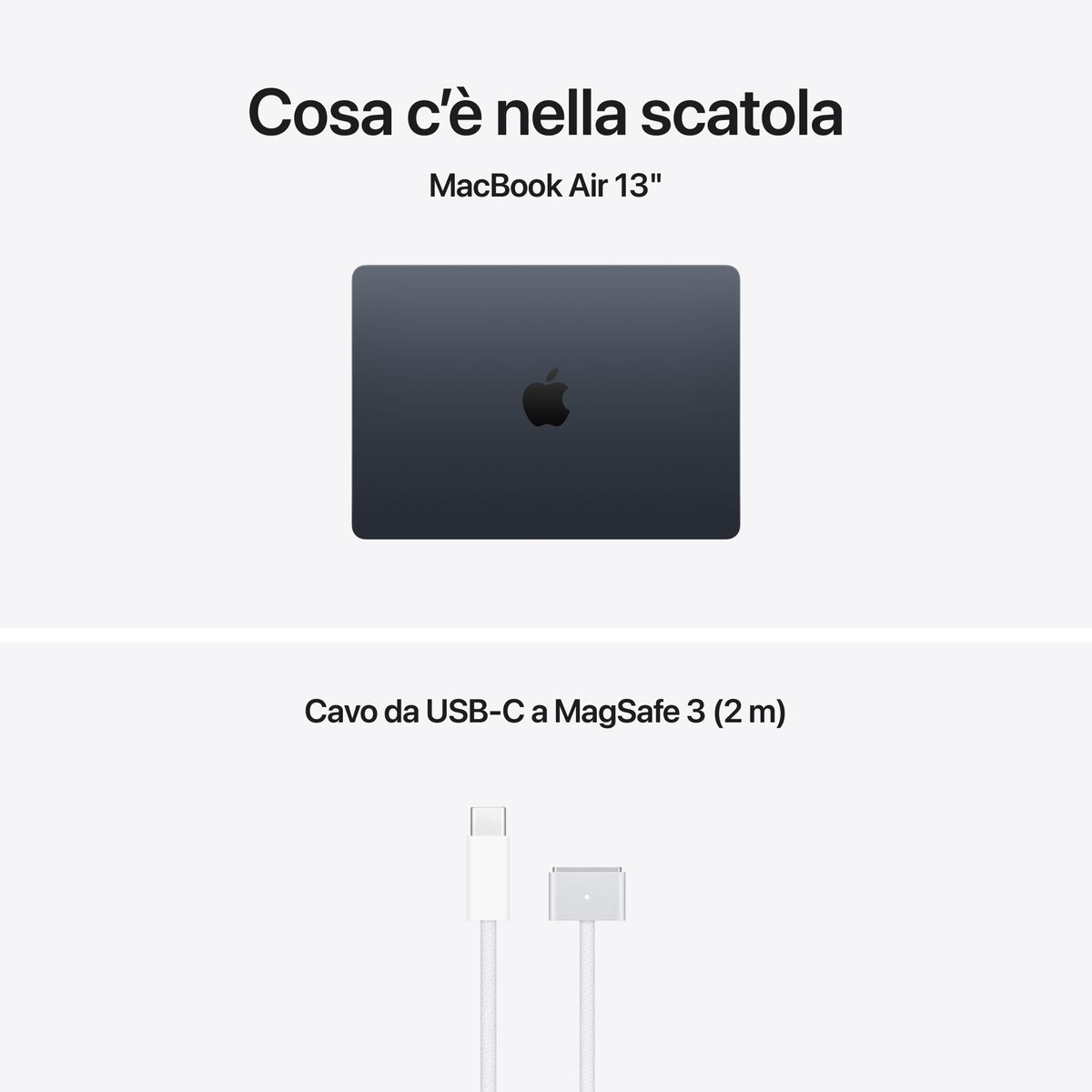 Apple MacBook Air 13" M5 chip 10‑core CPU 10‑core GPU, 16GB, 1TB SSD - Mezzanotte. Tipo di prodotto: Computer portatile, Fattore di forma: Clamshell. Famiglia processore: Apple M, Modello del processore: M5. Dimensioni diagonale schermo: 34,5 cm (13.6"), Risoluzione del display: 2560 x 1664 Pixel. Memoria Interna: 16 GB. Capacità totale di archiviazione: 1 TB, Supporto di memoria: SSD. Modello scheda grafica integrata: Apple GPU. Sistema operativo incluso: macOS Tahoe. Colore del prodotto: Blu marino. Peso: 1,23 kg