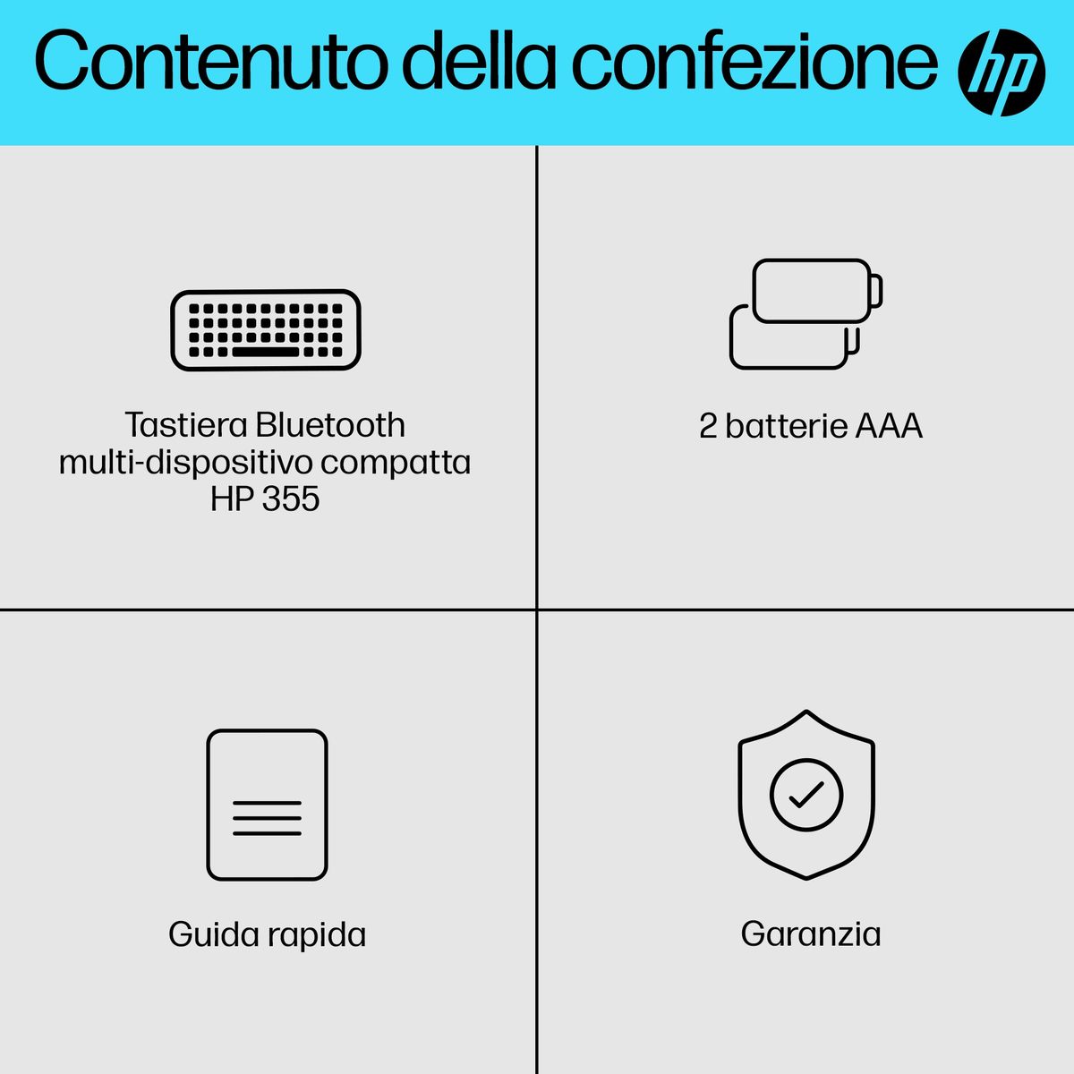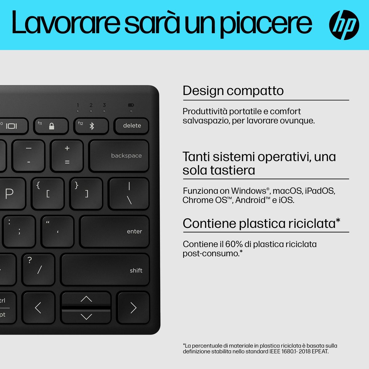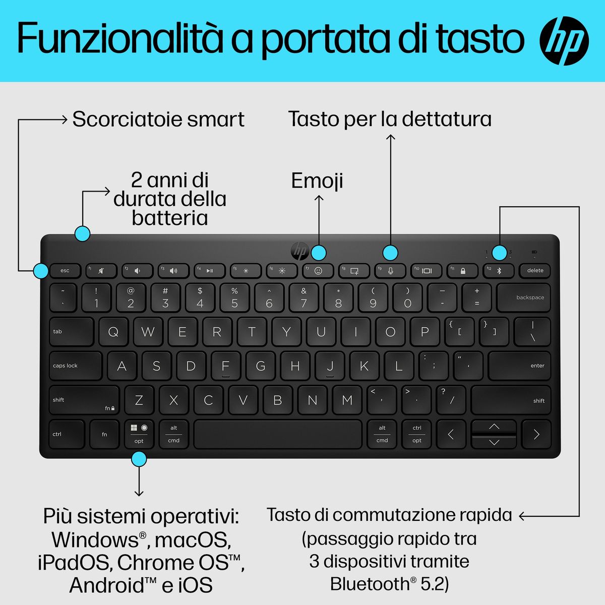 HP Tastiera Bluetooth multi-dispositivo compatta 355. Interfaccia dispositivo: Bluetooth, Interruttore a chiave per tastiera: Interruttore a chiave meccanica, Utilizzo raccomandato: Casa. Colore del prodotto: Nero