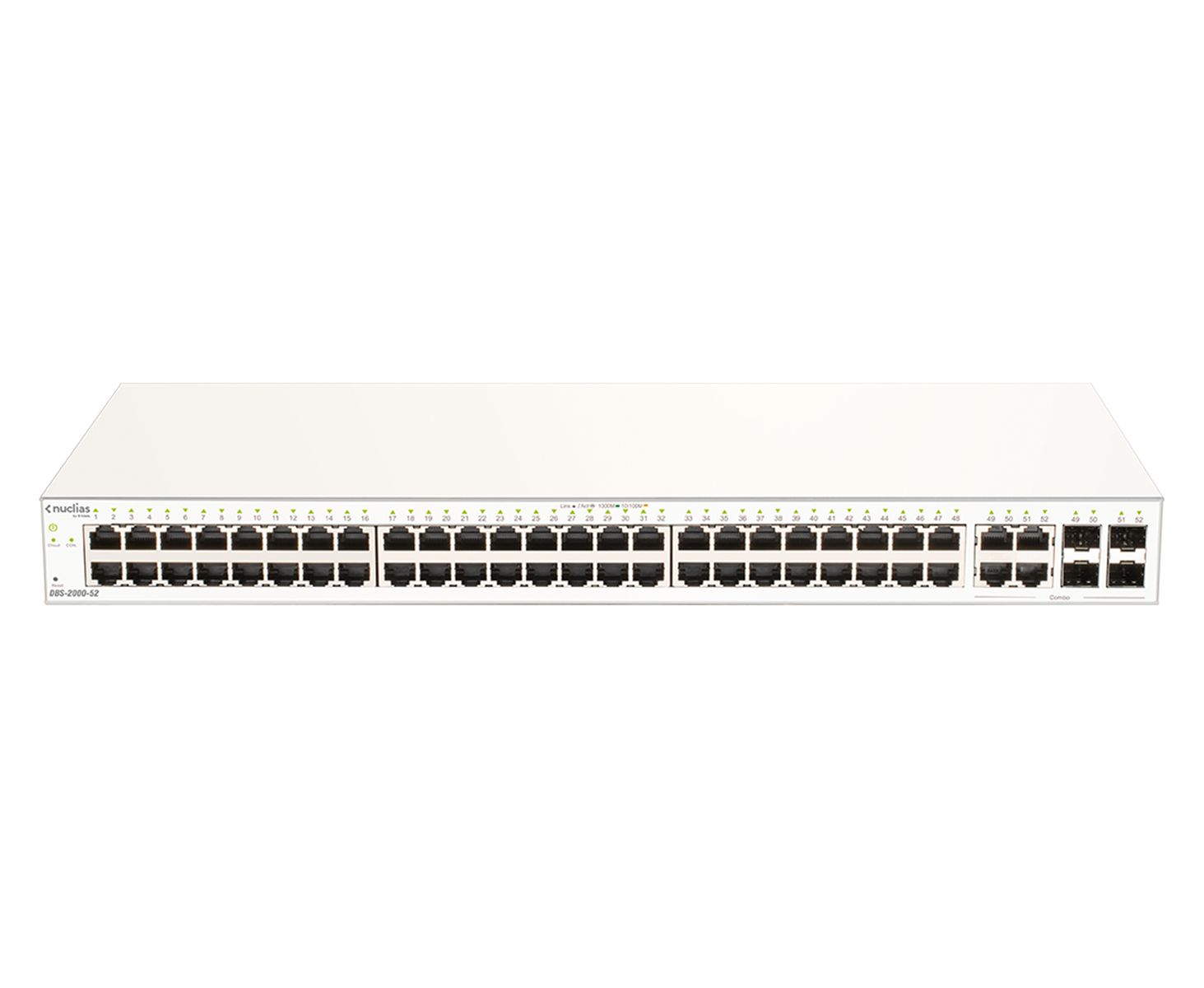 D-Link DBS-2000-52. Tipo interruttore: Gestito, Livello del commutatore: L2. Tipo di porte RJ-45: Gigabit Ethernet (10/100/1000), Quantità di porte RJ-45: 48, Console port: RJ-45. Capacità di commutazione: 104 Gbit/s. Standard di rete: IEEE 802.3ad. Montaggio rack