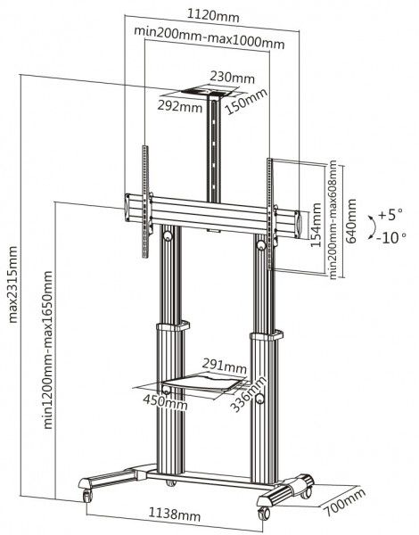 Reflecta 23211. Peso massimo (capacità): 100 kg, Capienza minima dimensioni dello schermo: 152,4 cm (60"), Capienza massima dimensioni dello schermo: 2,54 m (100"), Compatibilità interfaccia di montaggio (min): 200 x 200 mm, Compatibilità interfaccia di montaggio (max): 1000 x 600 mm. Regolazione altezza, Inclinazione: -10 - 5°. Colore del prodotto: Alluminio, Nero