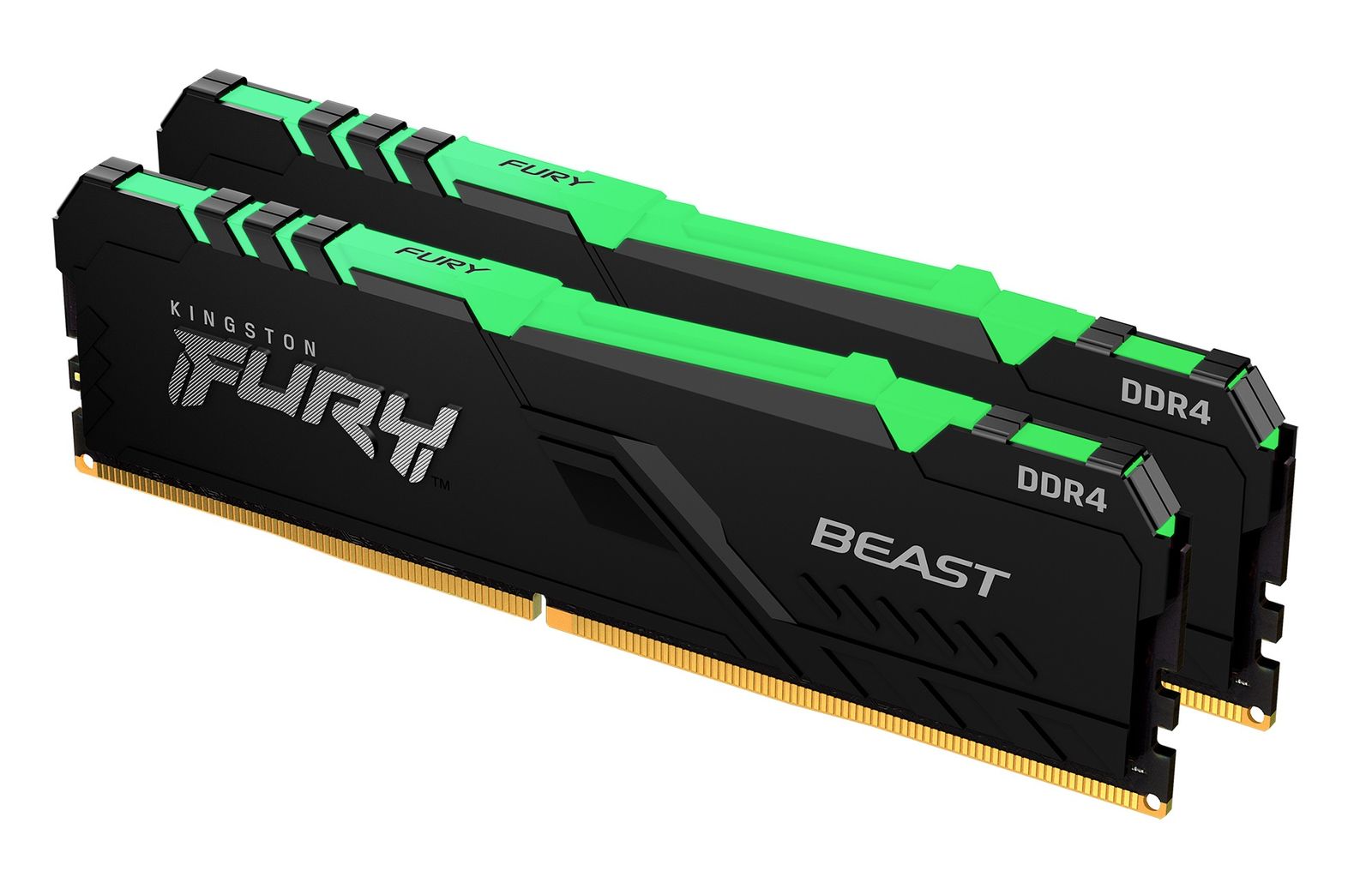 Kingston Technology FURY Beast RGB. Componente per: PC/server, RAM installata: 64 GB, Layout di memoria (moduli x dimensione): 2 x 32 GB, Tipo di RAM: DDR4, Velocità memoria: 3000 MHz, Fattore di forma memoria: 288-pin DIMM, Latenza CAS: 16