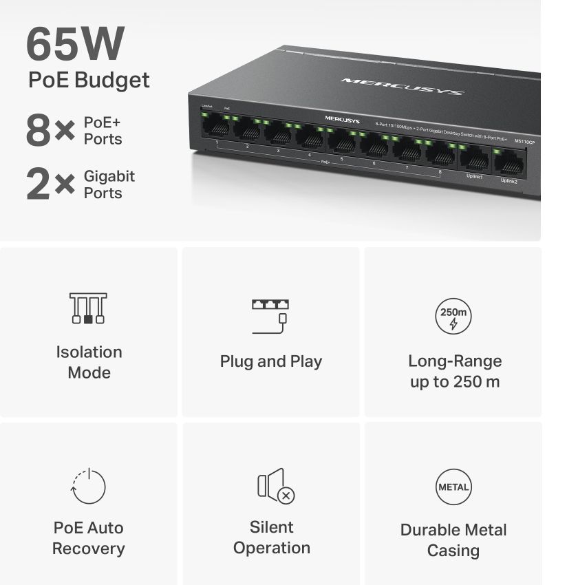 Mercusys MS110CP. Tipo di porte RJ-45: Fast Ethernet (10/100), Quantità di porte RJ-45: 10. Full duplex. Dimensioni tavola MAC: 2000 voci, Capacità di commutazione: 5,6 Gbit/s. Standard di rete: IEEE 802.3af, IEEE 802.3at, IEEE 802.3x. Voltaggio input DC: 53.5 V. Supporto Power over Ethernet (PoE). Montabile a parete