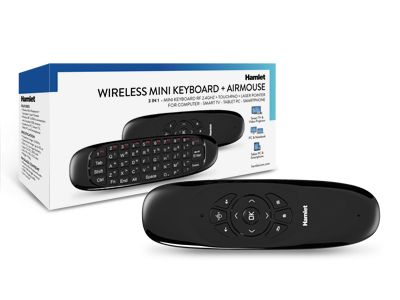 Hamlet Wireless Mini Keyboard + Air Mouse mini tastiera Qwerty, air mouse e telecomando. Struttura tastiera: QWERTY. Compatibilità marca: Ogni marca, Compatibilità: PC TV Projector Tablet Smartphone, Colore del prodotto: Nero. Tecnologia di connessione: Wireless, Interfaccia dispositivo: USB, Banda di frequenza: 2.4 GHz. Alimentazione: Batteria, Tipo batteria: Batteria integrata, Tecnologia batteria: Ioni di Litio. Sistema operativo mobile supportato: Android, iOS