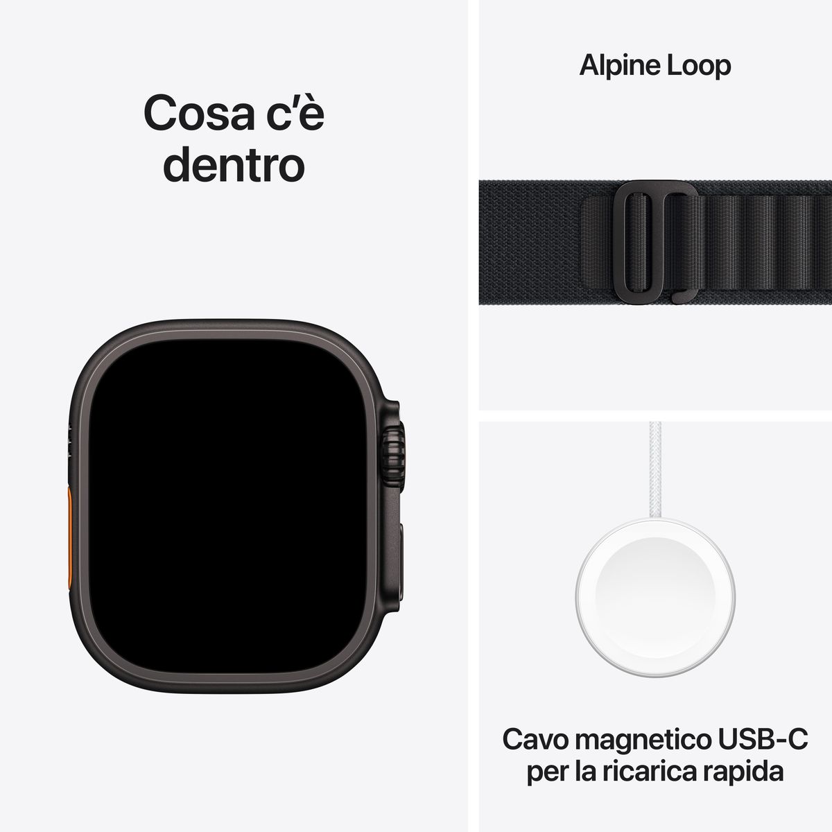 Apple Watch Ultra 3 GPS + Cellular 49mm Cassa Titanio Nero con Alpine Loop Nero- Large. Tecnologia display: OLED, Risoluzione del display: 422 x 514 Pixel, Touch screen. Memoria flash: 64 GB. Wi-Fi. GPS (satellitare). Peso: 61,8 g. Impermeabile fino a: 100 m, Colore cinturino: Nero, Dimensione del cinturino: L. Sistema operativo incluso: watchOS 11