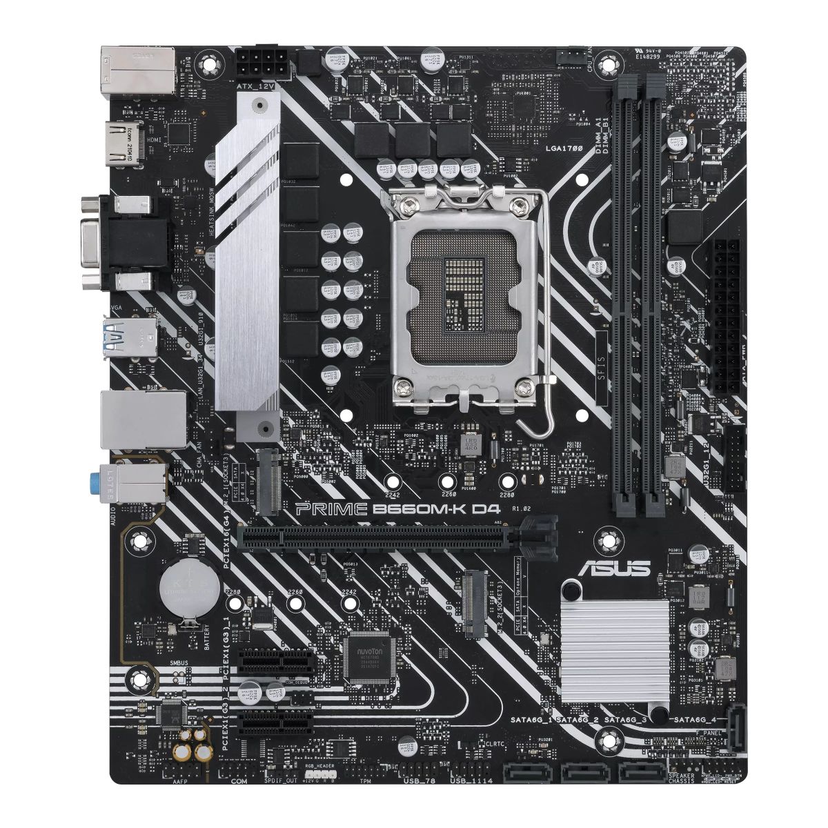 ASUS 1700 PRIME B660M-K D4 M-ATX. Produttore processore: Intel, Presa per processore: LGA 1700, Processori compatibili: Intel® Celeron®, Intel® Core™ i3, Intel® Core™ i5, Intel® Core™ i7, Intel® Core™ i9,.... Tipi di memoria supportati: DDR4-SDRAM, RAM massima supportata: 128 GB, tipo di slot di memoria: DIMM. Interfacce dell'unità di archiviazione supportate: M.2, SATA III, Tipi di unità di archiviazione supportate: HDD & SSD, Livelli RAID: 0, 1, 5, 10. Tipo di interfaccia Ethernet: Gigabit Ethernet. Componente per: PC, Fattore di forma scheda madre: micro ATX, Famiglia di chipset per scheda madre: Intel
