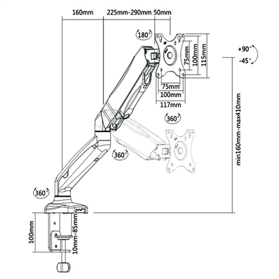 ITB RO17.99.1155. Montaggio: Morsa, Peso massimo (capacità): 10 kg, Capienza minima dimensioni dello schermo: 25,4 cm (10"), Capienza massima dimensioni dello schermo: 68,6 cm (27"), Compatibilità interfaccia di montaggio (min): 75 x 75 mm, Compatibilità interfaccia di montaggio (max): 100 x 100 mm. Regolazione altezza, Inclinazione: -45 - 90°. Colore del prodotto: Nero