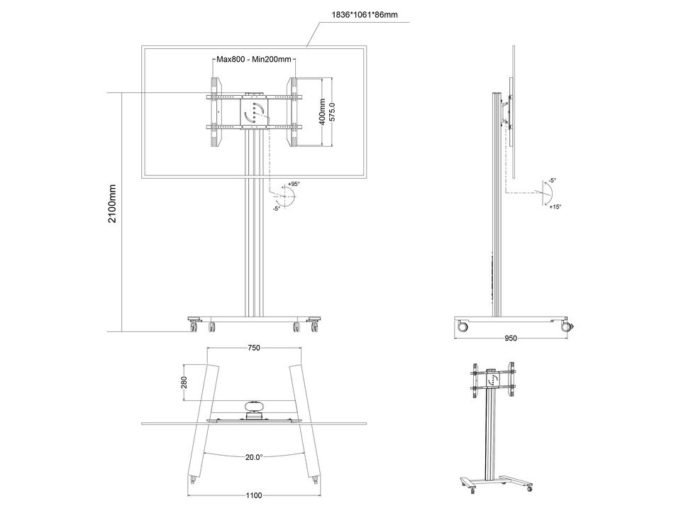 Multibrackets 5341. Peso massimo (capacità): 60 kg, Capienza minima dimensioni dello schermo: 139,7 cm (55"), Capienza massima dimensioni dello schermo: 2,03 m (80"), Compatibilità interfaccia di montaggio (max): 800 x 500 mm. Inclinazione: -5 - 15°. Colore del prodotto: Argento
