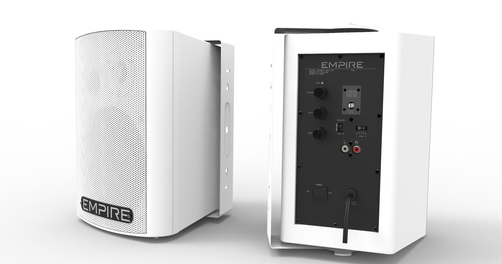 Empire Media HT.WALL300U. Sistema audio: 2.0 canali, Potenza in uscita (RMS): 150 W, Utilizzo raccomandato: Universale. Tipologia altoparlante satellite: 2-vie. Alimentazione: AC, Tensione di ingresso AC: 220 V, Frequenza di ingresso AC: 50 Hz. Larghezza: 195 mm, Profondità: 220 mm, Altezza: 310 mm. Cavi inclusi: AC, Audio (3.5mm)
