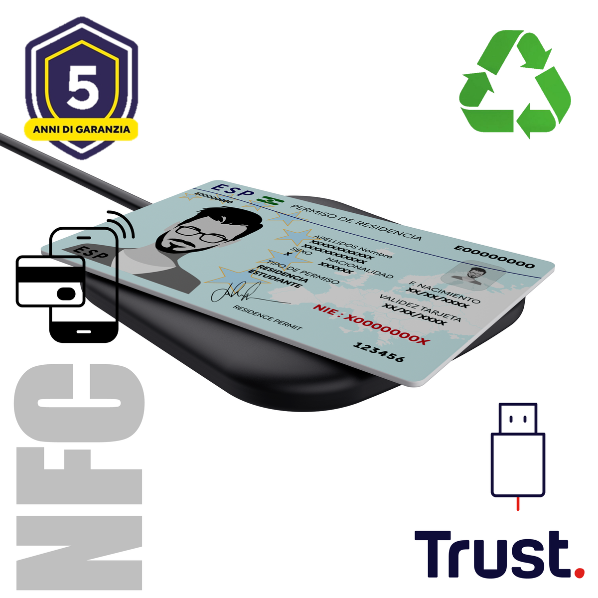Trust Ceto. Interfaccia: USB 2.0. Metodi di pagamento supportati: Senza contatto. Lunghezza cavo: 0,6 m, Colore del prodotto: Nero. Peso: 36 g