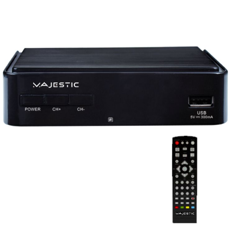 New Majestic DEC-665 HD USB. Fonte segnale: Terrestre, Formato del segnale digitale: DVB-T HD, DVB-T2 HD. Colore del prodotto: Nero, Tipo sintonizzatore: Digitale, Numero di sintonizzatori: 1 sintonizzatore/sintonizzatori. Consumi: 5 W, Tensione di ingresso AC: 100 - 240 V, Frequenza di ingresso AC: 50 - 60 Hz. Larghezza: 125 mm, Profondità: 87 mm, Altezza: 32 mm