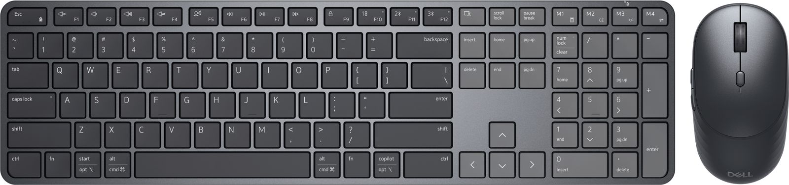 DELL Pro 7 Slim KM726. Fattore di forma tastiera: Full-size (100%). Stile tastiera: Dritto. Tecnologia di connessione: Wireless, Interfaccia dispositivo: RF senza fili + Bluetooth, Interruttore a chiave per tastiera: Tasto con meccanismo a forbici, Struttura tastiera: QWERTY, Utilizzo raccomandato: Casa/ufficio. Colore del prodotto: Nero. Mouse incluso