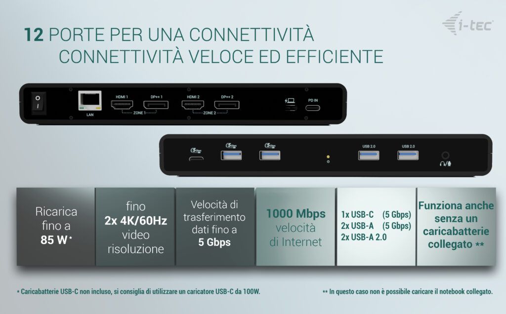 i-tec Universal Dual 4K Display Docking Station + Power Delivery 85W. Tecnologia di connessione: Cablato, Interfaccia host: USB 3.2 Gen 1 (3.1 Gen 1) Type-C, Fornitura di alimentazione USB fino a: 85 W. Velocità trasferimento Ethernet LAN: 10,100,1000 Mbit/s. Colore del prodotto: Nero, Velocità di trasferimento dati: 5 Gbit/s, Tempo massimo di refresh: 60 Hz. Tipologia alimentazione: AC, Alimentazione: 100 W, Tipi di prese compatibili: EU. Altri sistemi operativi supportati: Android, ChromeOS