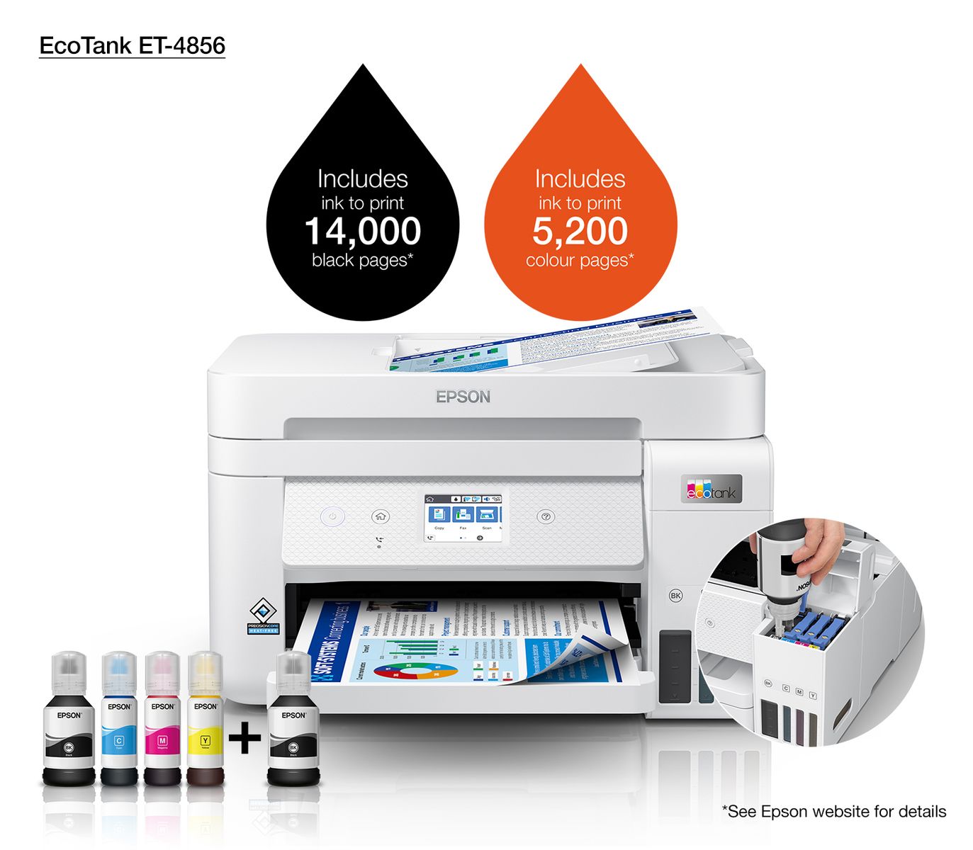 Epson EcoTank ET-4856. Tecnologia di stampa: Ad inchiostro, Stampa: Stampa a colori, Risoluzione massima: 4800 x 1200 DPI, Velocità di stampa (colore, qualità normale, A4/US Letter): 20 ppm. Copia: Copia a colori. Scansione: Scansione a colori, Risoluzione di scansione ottica: 1200 x 2400 DPI. Funzione duplex: Stampa. Massimo formato carta serie ISO A: A4. Wi-Fi. Stampa diretta. Colore del prodotto: Bianco