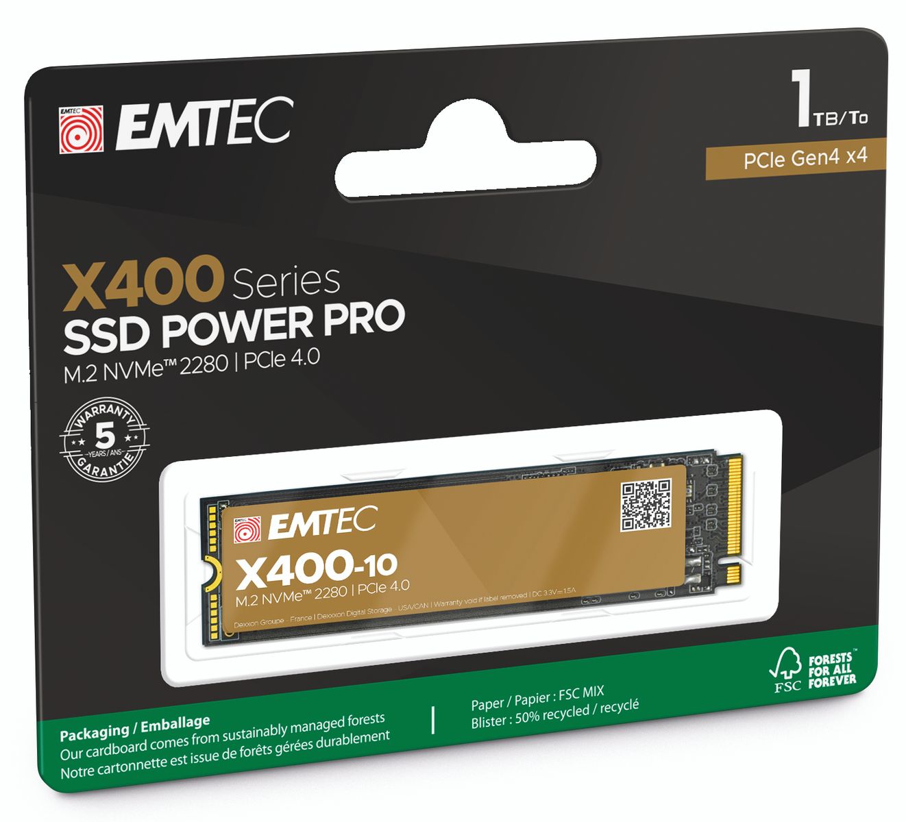 Emtec X400. Capacità SSD: 1 TB, Dimensione SSD: M.2, Velocità di lettura: 5200 MB/s, Velocità di scrittura: 2000 MB/s, Componente per: PC