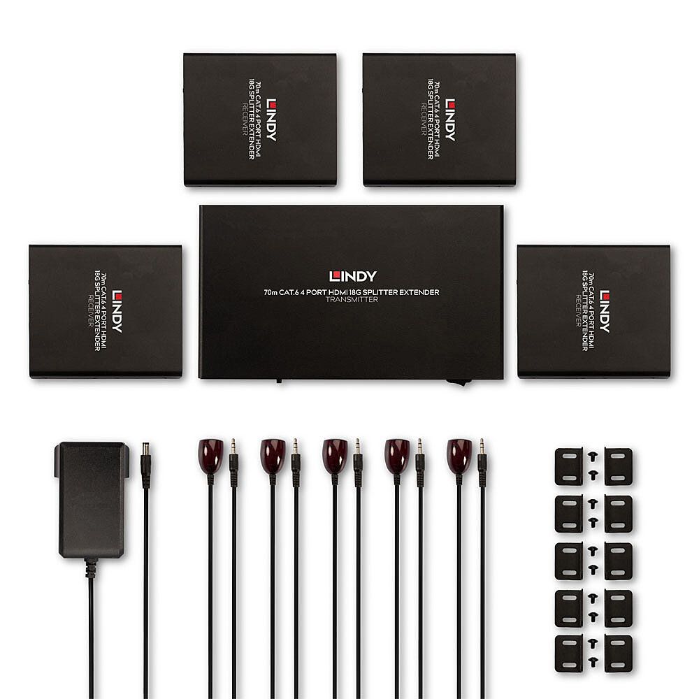 Lindy 38262. Tipo: Trasmettitore e ricevitore AV, Risoluzione massima: 3840 x 2160 Pixel, Tipi di cavi supportati: Cat6. Tecnologia di connessione: Cablato. Dimensi ricevitore (W x D x H): 100 x 88 x 23 mm, Peso del ricevitore: 199 g, Dimensioni del trasmettitore (AxPxH): 180 x 103 x 23 mm. Larghezza imballo: 423 mm, Profondità imballo: 60 mm, Altezza imballo: 354 mm. Cavi inclusi: IR, Sensore ai raggi infrarossi