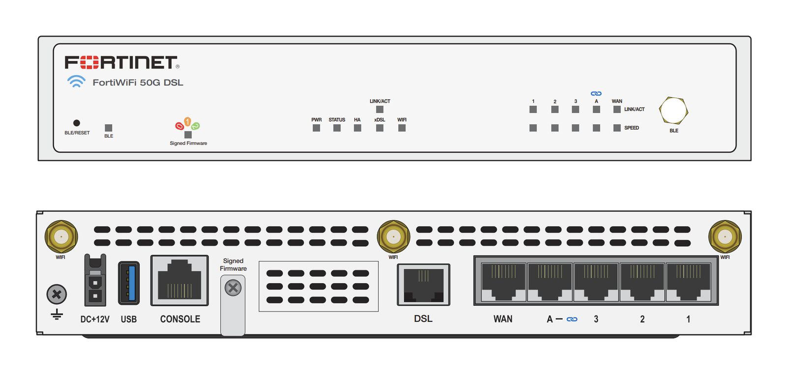 Fortinet FortiWiFi-50G-DSL. Velocità di trasmissione del firewall: 5 Gbit/s, Throughput del firewall: 6 Mpps, Capacità di trasmissione del firewall (UDP 1518): 5 Gbit/s. Design dell'antenna: Esterno. Standard Wi-Fi: 802.11a, 802.11b, 802.11g, Wi-Fi 4 (802.11n), Wi-Fi 5 (802.11ac), Wi-Fi 6 (802.11ax). Tecnologia di connessione: Con cavo e senza cavo, Velocità trasferimento Ethernet LAN: 10,100,1000 Mbit/s, Console port: RJ-45. Fattore di forma: Desktop
