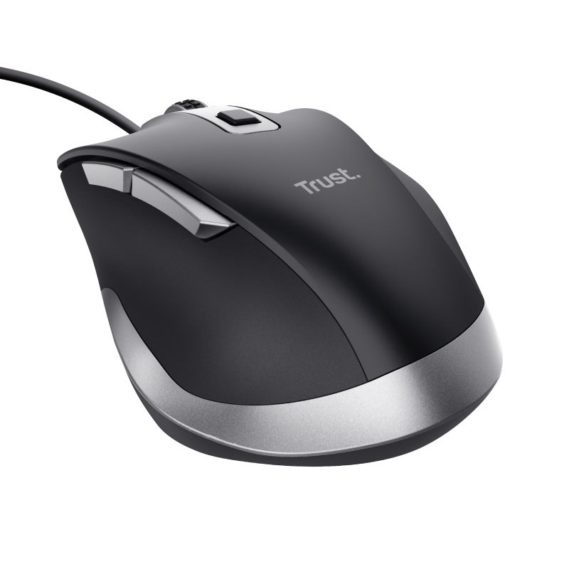 Trust Fyda. Fattore di forma: Mano destra. Tecnologia di rilevamento del movimento: Ottico, Interfaccia dispositivo: USB tipo A, Risoluzione movimento: 5000 DPI, Tipo di pulsanti: Tasti premuti, Numero di tasti: 6, Tipo di scorimmento: Rotella. Alimentazione: Cavo. Colore del prodotto: Nero
