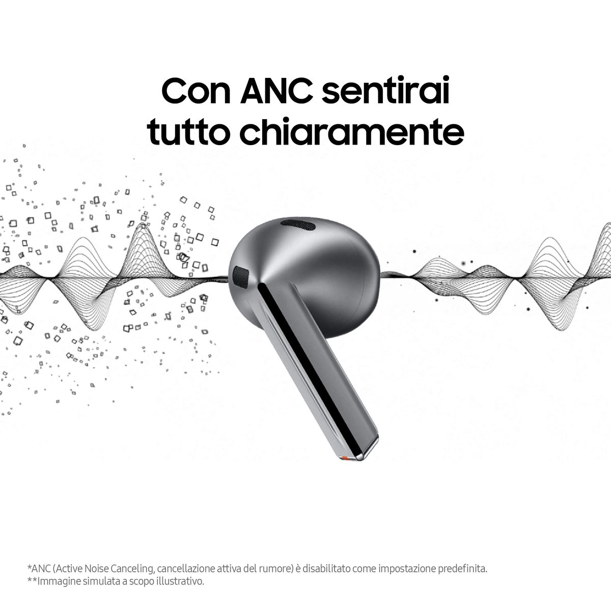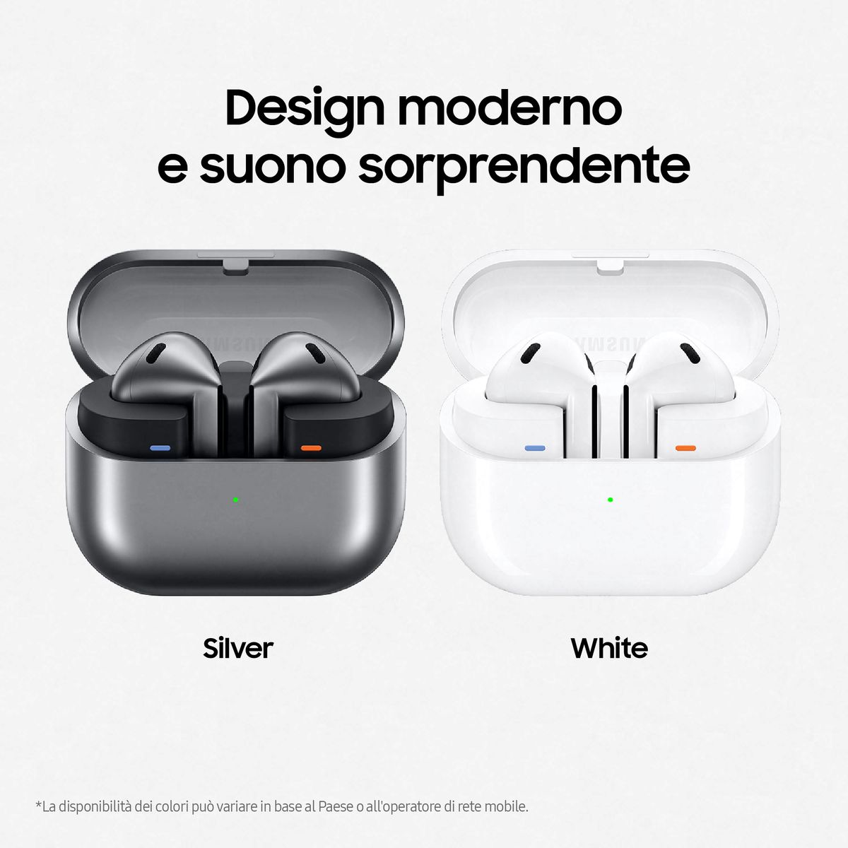 Samsung Galaxy Buds3 Auricolari AI open-type True Wireless, Audio Hi-Fi, Impermeabilità IP57, Silver. Tipo di prodotto: Auricolare. Tecnologia di connessione: True Wireless Stereo (TWS), Bluetooth. Utilizzo raccomandato: Musica e Chiamate. Peso: 4,7 g. Colore del prodotto: Argento