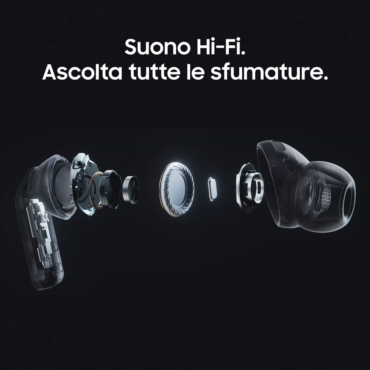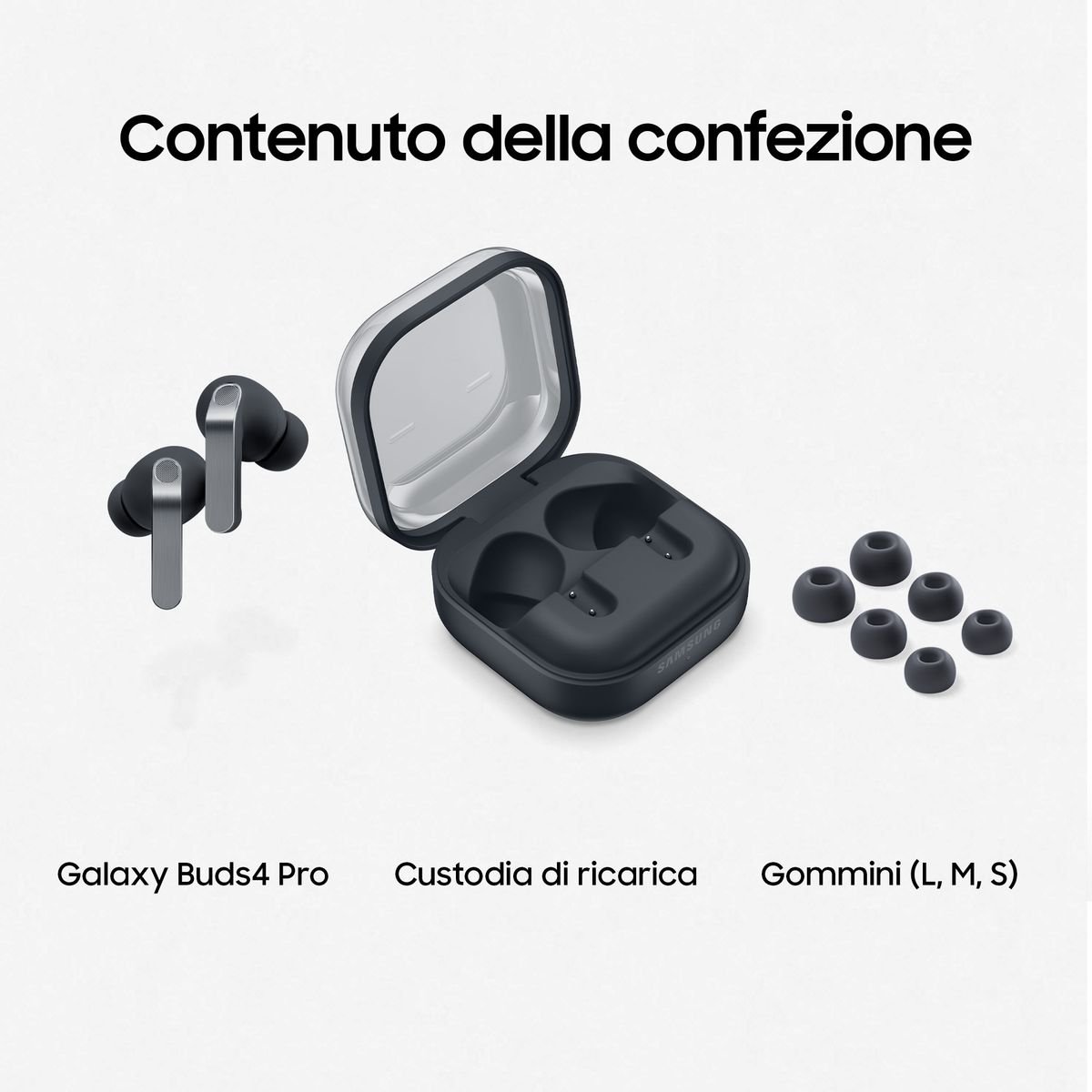 Samsung Galaxy Buds4 Pro, Black, Corpo in metallo, Altoparlante a 2 vie e doppio amplificatore, Chiamate cristalline, Audio a 360°, ANC migliorata, Controllo adattivo del rumore, Connessione senza interruzioni e One UI, AI pronto ai comandi vocali. Tipo di prodotto: Auricolare. Tecnologia di connessione: True Wireless Stereo (TWS), Bluetooth. Utilizzo raccomandato: Musica e Chiamate. Peso: 5,1 g. Colore del prodotto: Nero