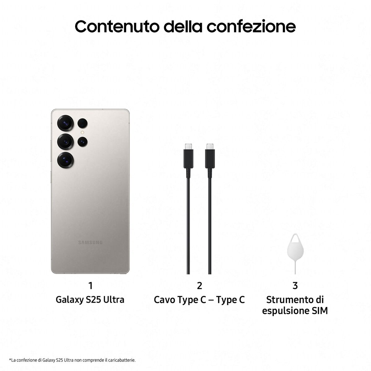 Samsung Galaxy S25 Ultra Smartphone AI, Display 6.9'' QHD+ Dynamic AMOLED 2X, Fotocamera 200MP, RAM 12GB, 256GB, 5.000 mAh, Titanium Gray. Dimensioni diagonale schermo: 17,5 cm (6.9"), Risoluzione del display: 3120 x 1440 Pixel. Famiglia processore: Qualcomm Snapdragon, Modello del processore: 8 Elite. Capacità della RAM: 12 GB, Capacità memoria interna: 256 GB. Risoluzione fotocamera posteriore (numerico): 200 MP, Tipo di fotocamera posteriore: Telecamera per quad. Capacità della scheda SIM: Doppia SIM. Sistema operativo incluso: Android 15. Capacità della batteria: 5000 mAh. Colore del prodotto: Grigio, Titanio. Peso: 218 g