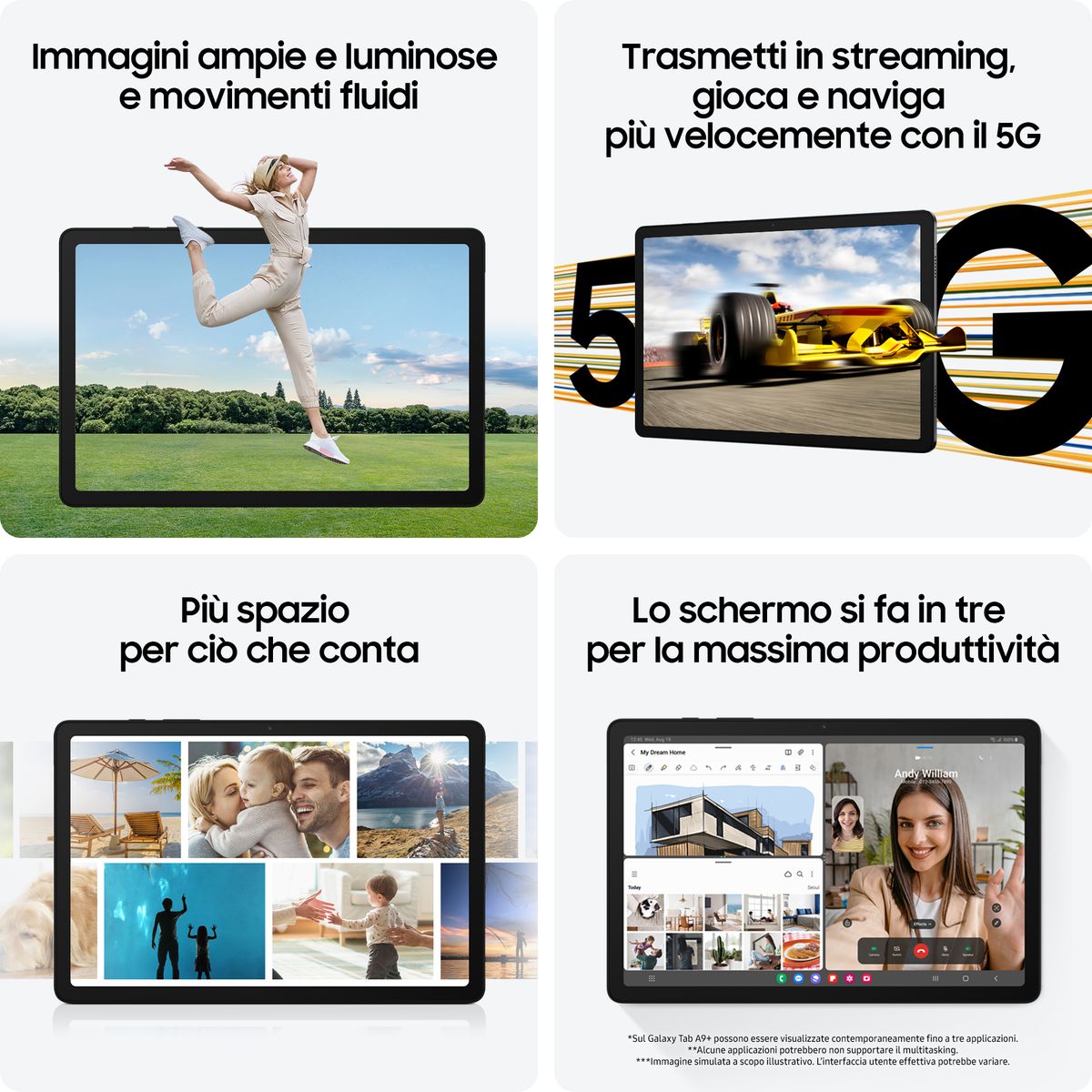 Samsung Galaxy Tab A9+ SM-X216RZAREUE. Dimensioni diagonale schermo: 27,9 cm (11"), Risoluzione del display: 1920 x 1200 Pixel. Capacità memoria interna: 128 GB. Famiglia processore: Qualcomm Snapdragon, Modello del processore: SM6375. RAM installata: 6 GB. Risoluzione fotocamera posteriore (numerico): 8 MP, Tipo di fotocamera posteriore: Fotocamera singola, Risoluzione fotocamera frontale (numerico): 5 MP. Wi-Fi standard: Wi-Fi 5 (802.11ac). Assistenza funzione GPS (A-GPS). Lettore di schede integrato. Peso: 491 g. Sistema operativo incluso: Android 13. Colore del prodotto: Grafite