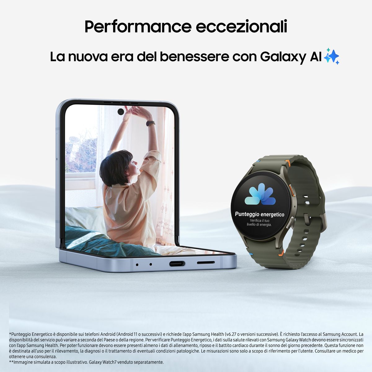 Samsung Galaxy Z Flip6 Smartphone AI, 512GB, RAM 12GB, Display 3,4" SAMOLED/6,7" Dynamic AMOLED 2X, Blue. Dimensioni diagonale schermo: 17 cm (6.7"), Risoluzione del display: 2640 x 1080 Pixel. Famiglia processore: Qualcomm Snapdragon, Modello del processore: 8 Gen 3. Capacità della RAM: 12 GB, Capacità memoria interna: 512 GB. Risoluzione fotocamera posteriore (numerico): 50 MP, Tipo di fotocamera posteriore: Doppia fotocamera. Capacità della scheda SIM: Doppia SIM. Sistema operativo incluso: Android 14. Capacità della batteria: 4000 mAh. Colore del prodotto: Blu. Peso: 187 g