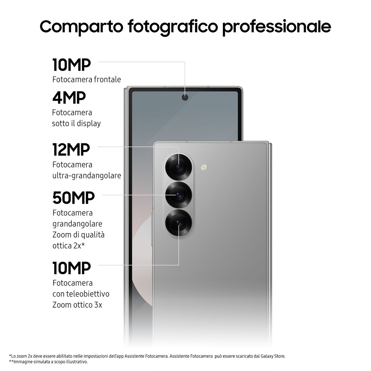 Samsung Galaxy Z Fold6 Smartphone AI, 1TB, RAM 12GB, Display 6,3"/7,6" Dynamic AMOLED 2X, Silver Shadow. Dimensioni diagonale schermo: 19,3 cm (7.6"), Risoluzione del display: 2160 x 1856 Pixel. Famiglia processore: Qualcomm Snapdragon, Modello del processore: 8 Gen 3. Capacità della RAM: 12 GB, Capacità memoria interna: 1 TB. Risoluzione fotocamera posteriore (numerico): 50 MP, Tipo di fotocamera posteriore: Tripla fotocamera. Capacità della scheda SIM: Doppia SIM. Sistema operativo incluso: Android 14. Capacità della batteria: 4400 mAh. Colore del prodotto: Argento. Peso: 239 g