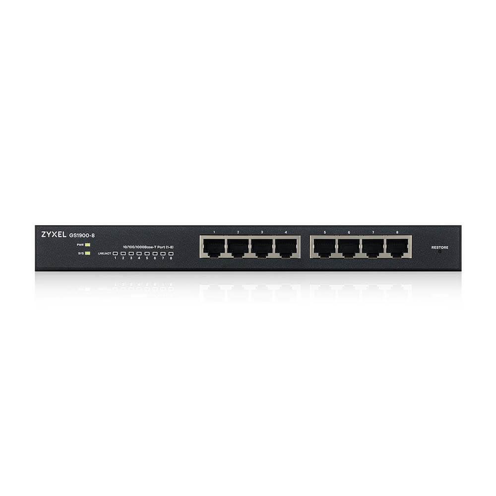 Zyxel GS1900-8. Tipo interruttore: Gestito, Livello del commutatore: L2. Tipo di porte RJ-45: Gigabit Ethernet (10/100/1000), Quantità di porte RJ-45: 8. Full duplex. Dimensioni tavola MAC: 8000 voci, Capacità di commutazione: 16 Gbit/s. Standard di rete: IEEE 802.1Q, IEEE 802.1p, IEEE 802.1x, IEEE 802.3, IEEE 802.3ab, IEEE 802.3ad, IEEE 802.3af, IEEE.... Connettore di alimentazione: Jack DC-ingresso. Montaggio rack
