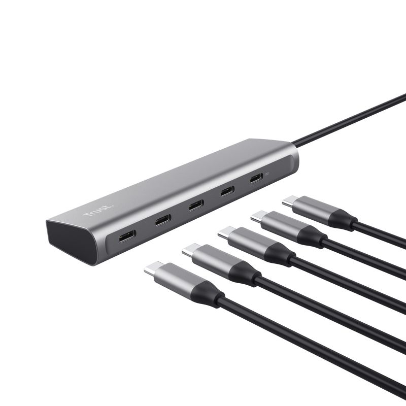 Trust Halyx. Interfaccia host: USB 3.2 Gen 1 (3.1 Gen 1) Type-C, Interfacce hub: USB tipo-C. Colore del prodotto: Argento, Materiale della scocca: Acrilonitrile butadiene stirene (ABS), Fornitura di alimentazione USB fino a: 100 W. Altri sistemi operativi supportati: ChromeOS. Larghezza: 127 mm, Profondità: 16 mm, Altezza: 32 mm. Quantità per pacco: 1 pz