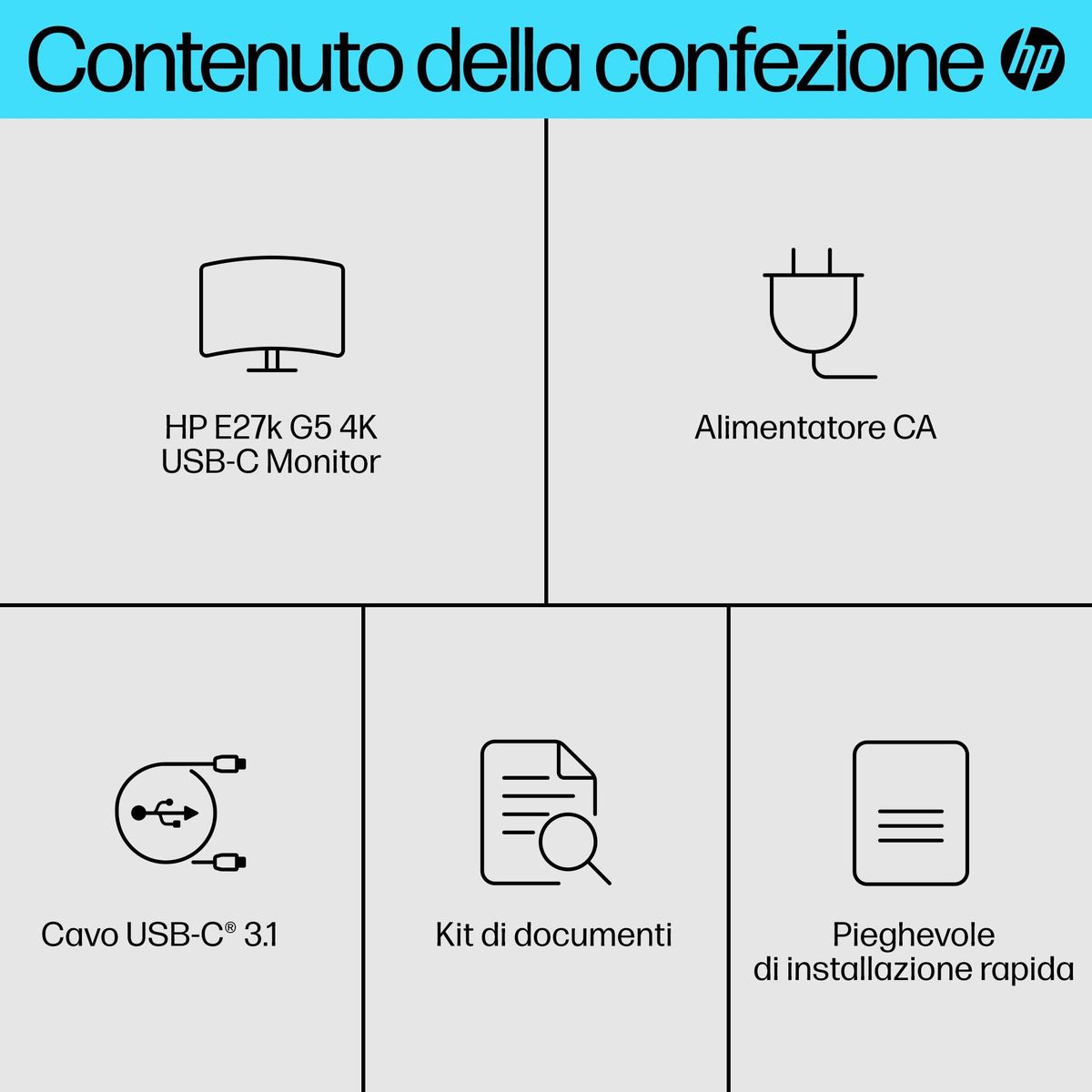 HP E-Series E27k G5. Dimensioni schermo: 68,6 cm (27"), Risoluzione del display: 3840 x 2160 Pixel, Tipologia HD: 4K Ultra HD, Tempo di risposta: 5 ms, Rapporto d'aspetto nativo: 16:9, Angolo di visualizzazione (orizzontale): 178°, Angolo di visualizzazione (verticale): 178°. Altoparlanti incorporati. Montaggio standard VESA, Regolazione altezza. Colore del prodotto: Nero, Argento