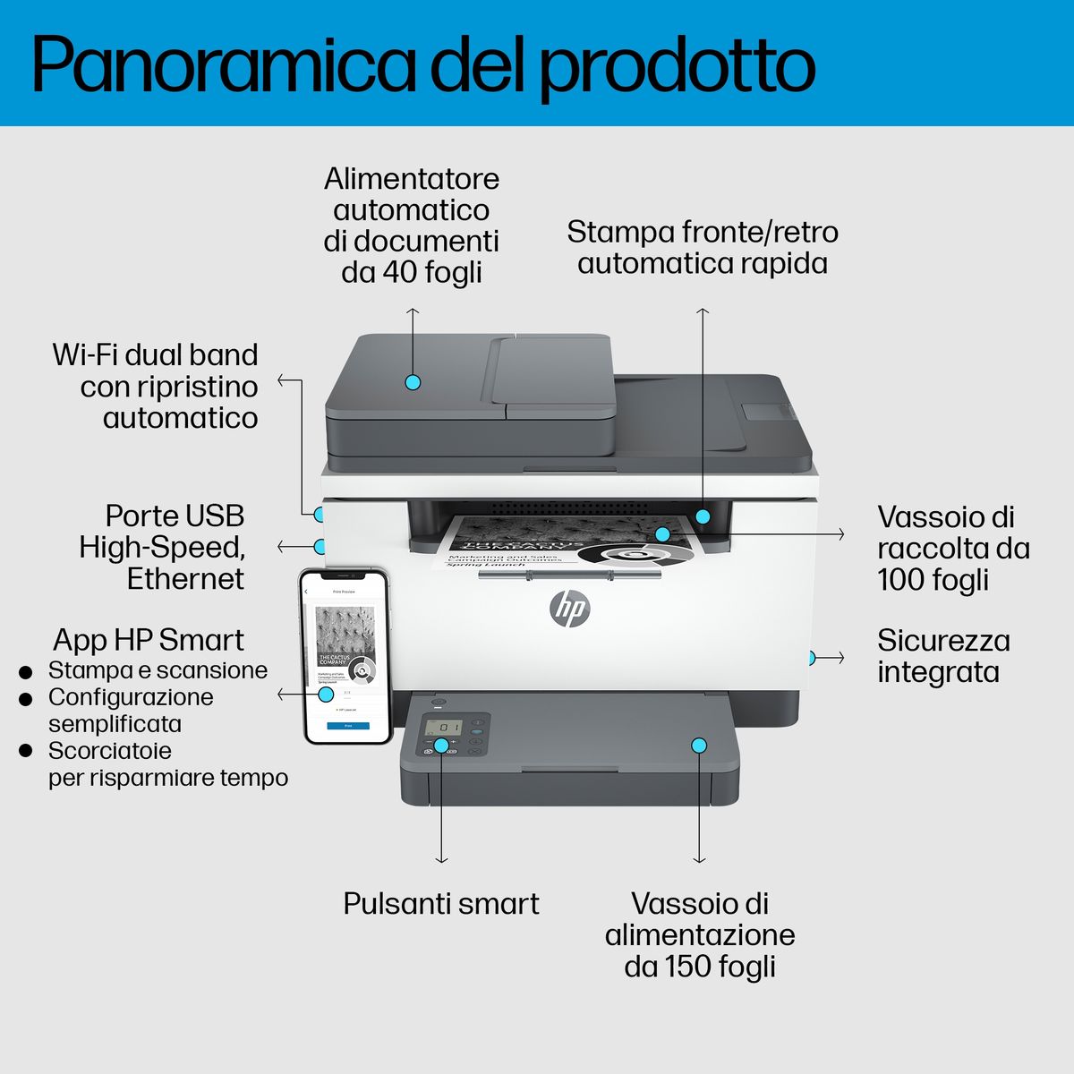 HP LaserJet Stampante multifunzione M235sdw. Tecnologia di stampa: Laser, Stampa: Mono stampa, Risoluzione massima: 600 x 600 DPI. Copia: Mono copia, Risoluzione di copia massima: 600 x 600 DPI. Scansione: Scansione a colori, Risoluzione di scansione ottica: 600 x 600 DPI. Funzione duplex: Stampa. Massimo formato carta serie ISO A: A4. Wi-Fi. Stampa diretta. Colore del prodotto: Bianco