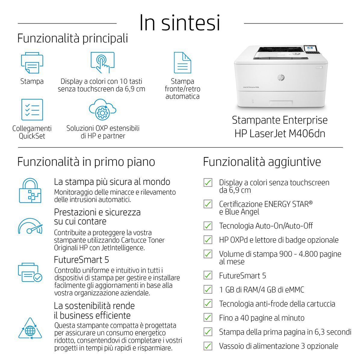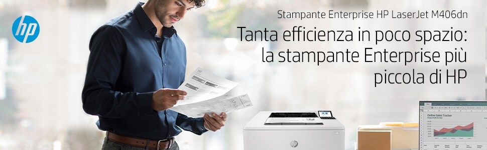 HP LaserJet Enterprise Stampante Enterprise LaserJet M406dn, Bianco e nero, Stampante per Aziendale, Stampa, Compatta; Avanzate funzionalità di sicurezza; Stampa fronte/retro; Efficienza energetica; Stampa da porta USB frontale. Tecnologia di stampa: Laser. Numero di cartucce di stampa: 1, Ciclo massimo di funzionamento: 100000 pagine per mese. Risoluzione massima: 1200 x 1200 DPI. Massimo formato carta serie ISO A: A4. Velocità di stampa (nero, qualità normale, A4/US Letter): 38 ppm, Stampa fronte/retro. Tipologia display: LCD. Rete pronta. Colore del prodotto: Bianco