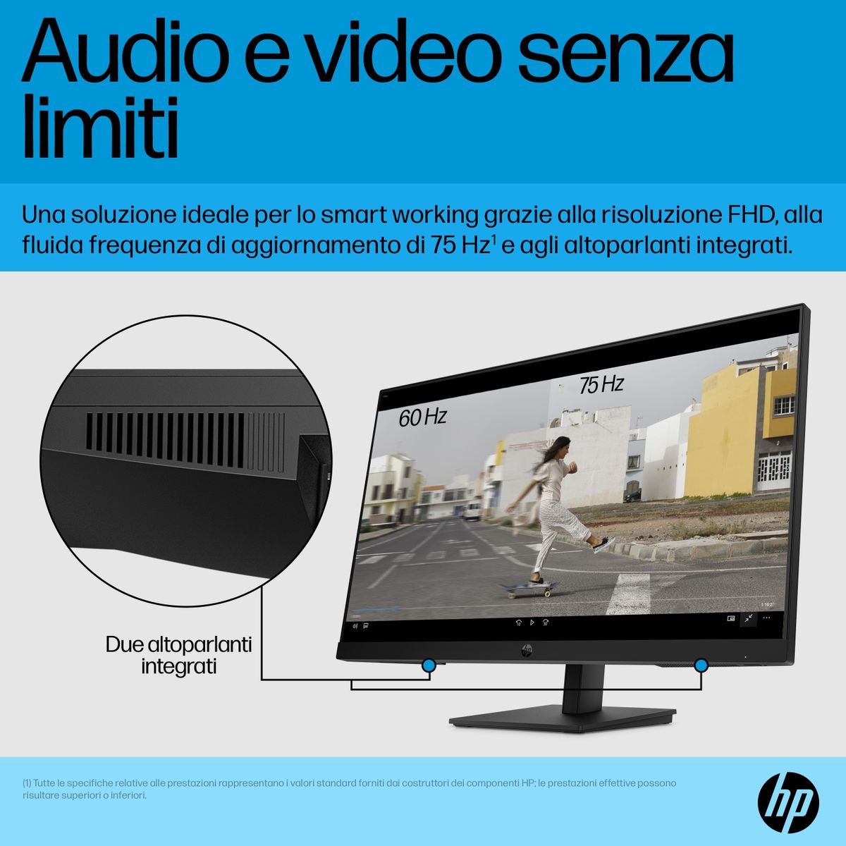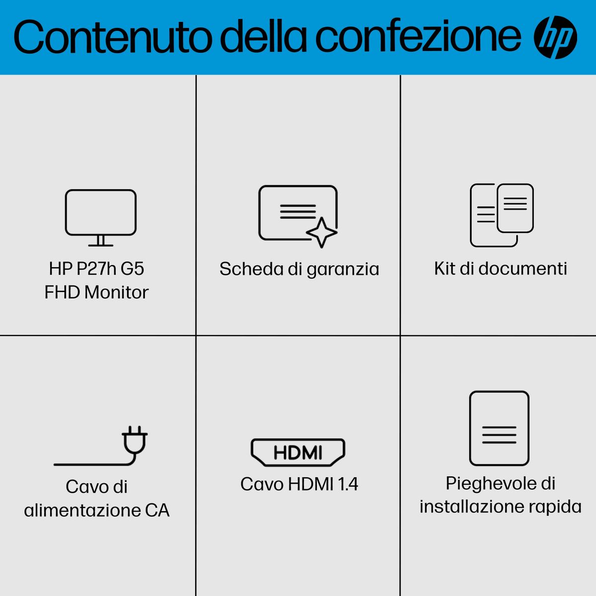 HP P27h G5. Dimensioni schermo: 68,6 cm (27"), Risoluzione del display: 1920 x 1080 Pixel, Tipologia HD: Full HD, Tempo di risposta: 5 ms, Rapporto d'aspetto nativo: 16:9, Angolo di visualizzazione (orizzontale): 178°, Angolo di visualizzazione (verticale): 178°. Altoparlanti incorporati. Montaggio standard VESA, Regolazione altezza. Colore del prodotto: Nero