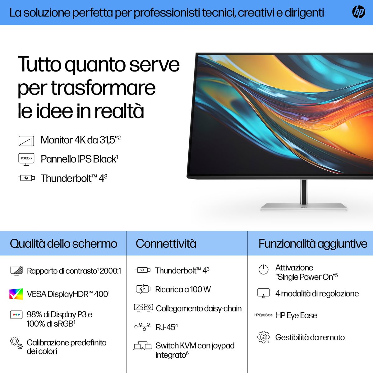 HP Monitor serie 7 Pro da 31,5” 4K Thunderbolt 4 – 732 pk. Dimensioni diagonale schermo: 80 cm (31.5"), Risoluzione del display: 3840 x 2160 Pixel, Tipologia HD: 4K Ultra HD, Tempo di risposta: 5 ms, Rapporto d'aspetto nativo: 16:9, Angolo di visualizzazione (orizzontale): 178°, Angolo di visualizzazione (verticale): 178°. Hub USB integrato. Montaggio standard VESA, Regolazione altezza. Colore del prodotto: Nero, Argento