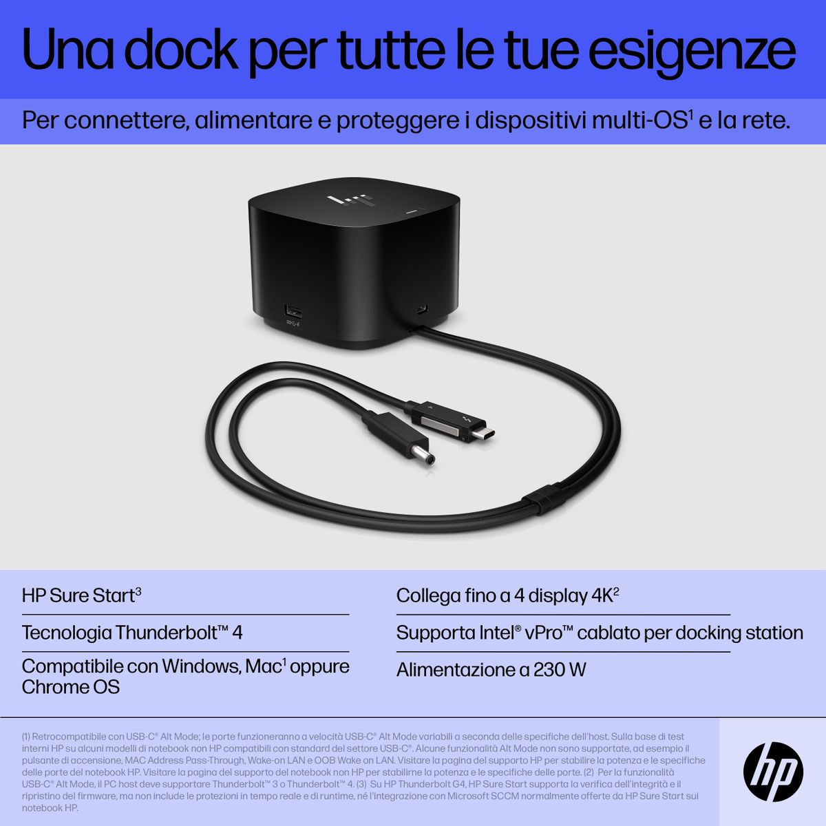 HP Thunderbolt Dock 280W G4 con cavo combo. Tecnologia di connessione: Cablato, Interfaccia host: Thunderbolt 4. Colore del prodotto: Nero, Tipologia slot blocco cavo: Kensington. Tensione di ingresso AC: 100 - 240 V, Frequenza di ingresso AC: 50 - 60 Hz, Corrente d'ingresso: 1.7 A. Larghezza: 98 mm, Profondità: 98 mm, Altezza: 68 mm. Larghezza imballo: 275 mm, Profondità imballo: 143 mm, Altezza imballo: 148,5 mm