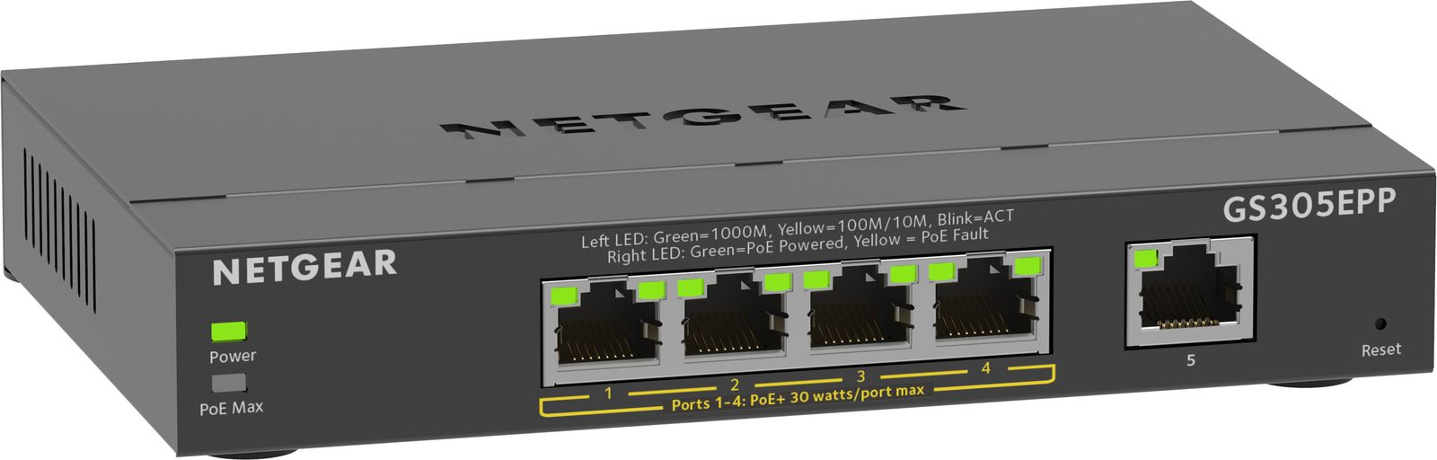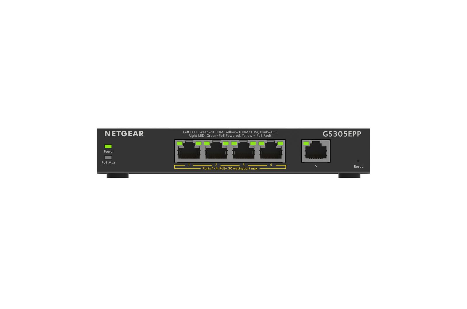 NETGEAR 5-Port Gigabit Ethernet High-Power PoE+ Plus Switch (GS305EPP). Tipo interruttore: Gestito, Livello del commutatore: L2/L3. Tipo di porte RJ-45: Gigabit Ethernet (10/100/1000), Quantità di porte RJ-45: 5. Full duplex. Dimensioni tavola MAC: 4000 voci, Capacità di commutazione: 10 Gbit/s. Standard di rete: IEEE 802.3, IEEE 802.3ab, IEEE 802.3u, IEEE 802.3x, IEEE 802.3at, IEEE 802.3af. Connettore di alimentazione: Jack DC-ingresso. Supporto Power over Ethernet (PoE)