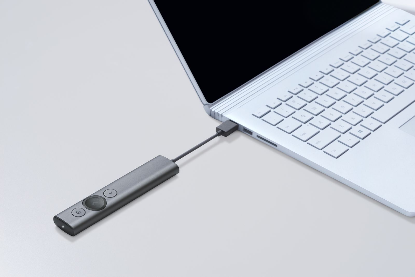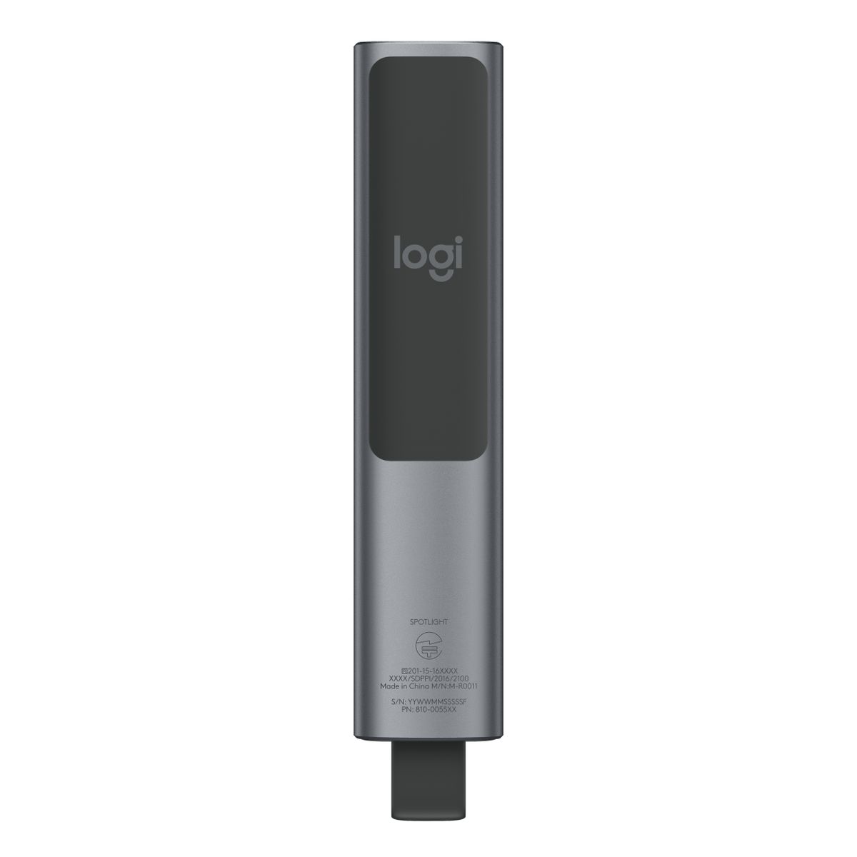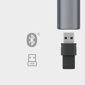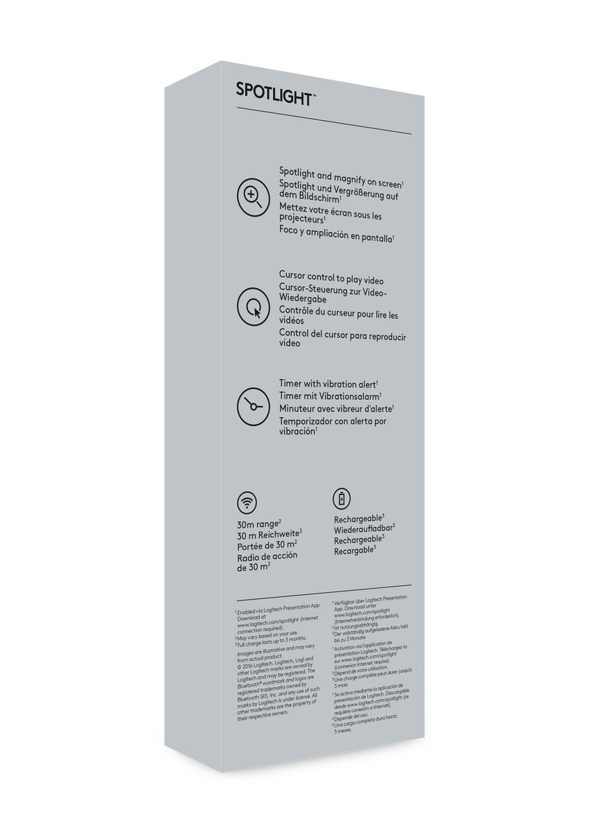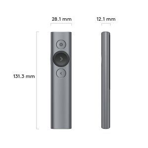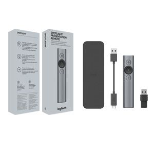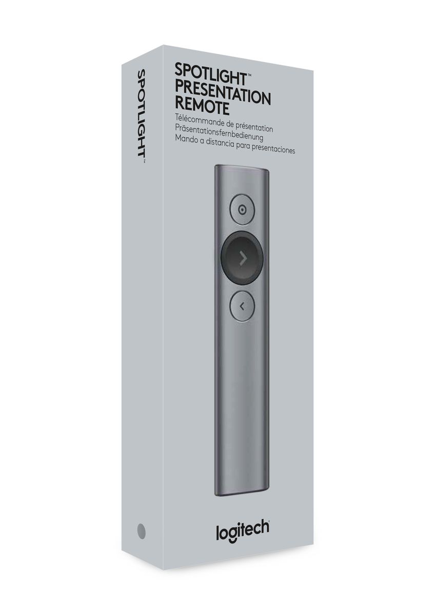 Logitech Spotlight. Tecnologia wireless: Bluetooth/RF, interfaccia ricevitore senza fili: USB, tipo di ricevitore: Mini ricevitore. Tecnologia batteria: Polimeri di litio (LiPo), Capacità della batteria: 85 mAh, Tempo di carica: 60 min. Colore del prodotto: Grigio, funzioni di presentazione: Telecomando, Materiali: Alluminio, Plastica. Ampiezza ricevitore: 1,72 cm, Profondità ricevitore: 4,04 cm, Altezza ricevitore: 6,8 mm. Sistema operativo Windows supportato: Windows 10, Windows 11, Windows 7, Windows 8, Windows 8.1, Compatibilità sistema operativo Mac: Mac OS X 10.10 Yosemite, Mac OS X 10.11 El Capitan, Mac OS X 10.12 Sierra, Mac OS X 10.13 High...