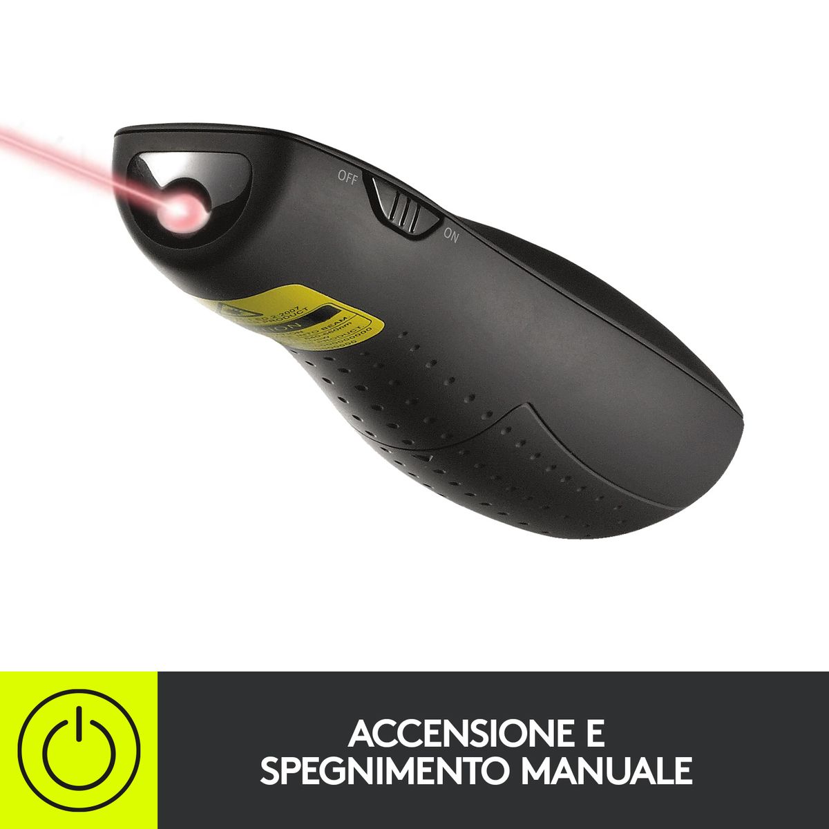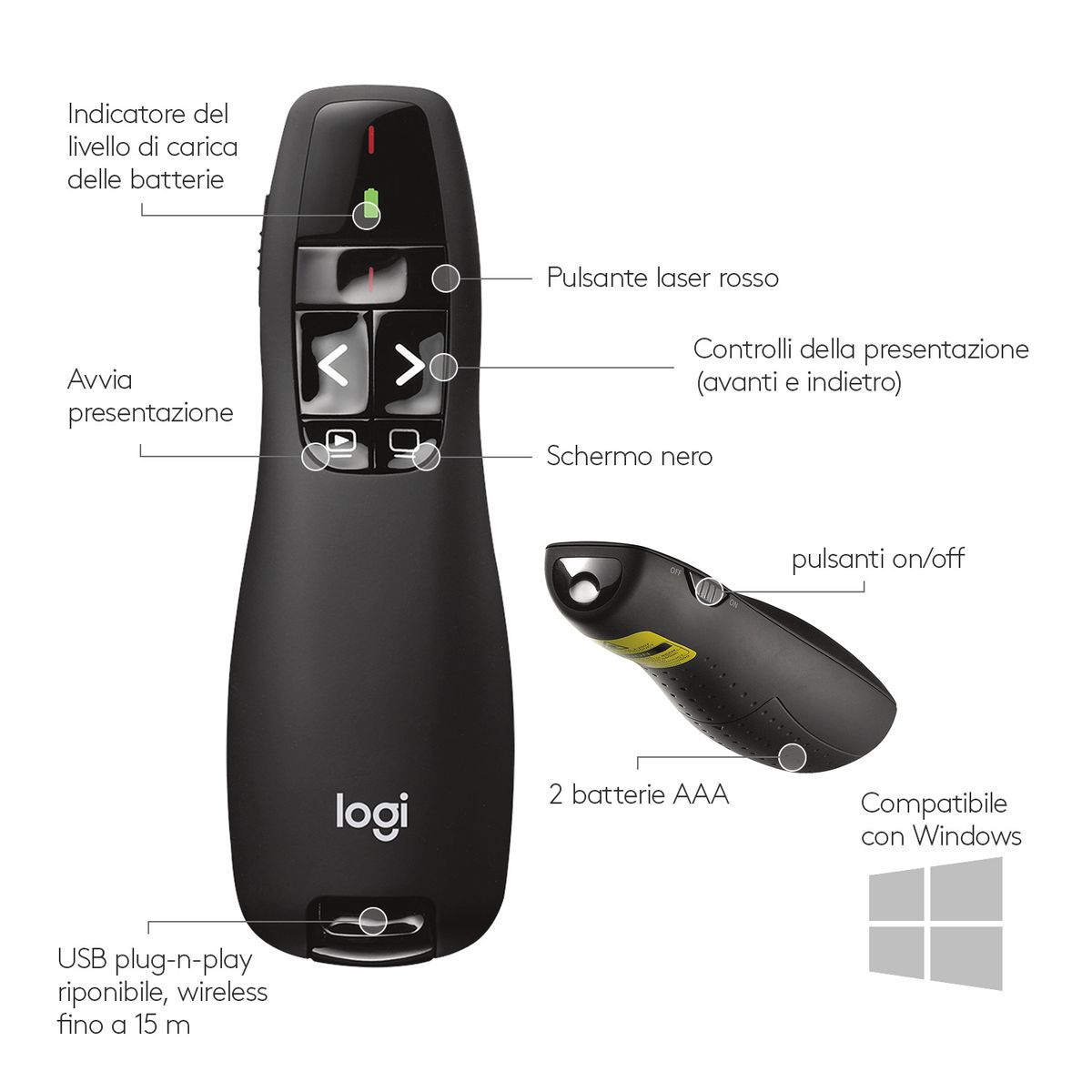 Logitech R400. Tecnologia wireless: RF, interfaccia ricevitore senza fili: USB, tipo di ricevitore: Mini ricevitore. Tecnologia batteria: Alcalino, Tipo batteria: AAA, Durata della batteria (puntatore laser): 20 h. Colore del prodotto: Nero, funzioni di presentazione: Puntatore laser, Telecomando, Colore del puntatore laser: Rosso. Ampiezza ricevitore: 5,86 cm, Profondità ricevitore: 7,9 mm, Altezza ricevitore: 1,65 cm. Sistema operativo Windows supportato: Windows 10, Windows 11, Windows 7, Windows 8, Windows 8.1, Windows Vista, Windows XP