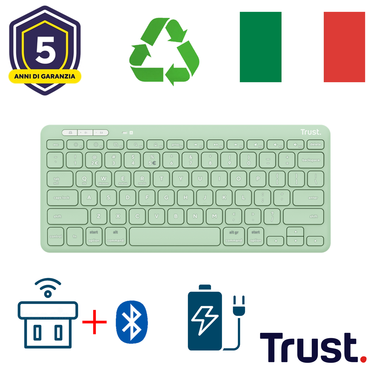 Trust Lyra Tastiera wireless compatta. Fattore di forma tastiera: Mini. Stile tastiera: Dritto. Tecnologia di connessione: Wireless, Interfaccia dispositivo: RF senza fili + Bluetooth, Interruttore a chiave per tastiera: Tasto con meccanismo a forbici, Struttura tastiera: QWERTY, Utilizzo raccomandato: Casa/ufficio. Colore del prodotto: Verde