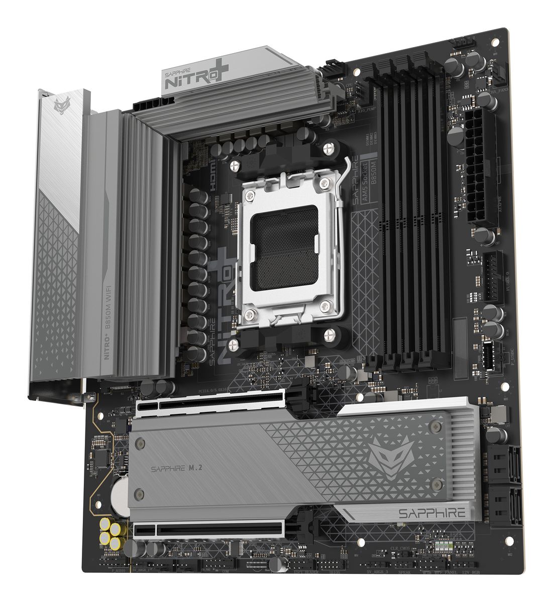 Sapphire NITRO+ B850M WIFI. Produttore processore: AMD, Presa per processore: Socket AM5, Processori compatibili: AMD Ryzen 7000 Series, AMD Ryzen 8000 Series, AMD Ryzen 9000 Series. Tipi di memoria supportati: DDR5-SDRAM, RAM massima supportata: 192 GB, tipo di slot di memoria: DIMM. Interfacce dell'unità di archiviazione supportate: PCI Express 4.0, PCI Express 5.0, SATA III, Tipi di unità di archiviazione supportate: HDD & SSD. Connettore USB: USB tipo A, USB tipo-C. Tipo di interfaccia Ethernet: 2.5 Gigabit Ethernet, Controller LAN: Dragon RTL8125BG, Wi-Fi standard: Wi-Fi 6 (802.11ax)