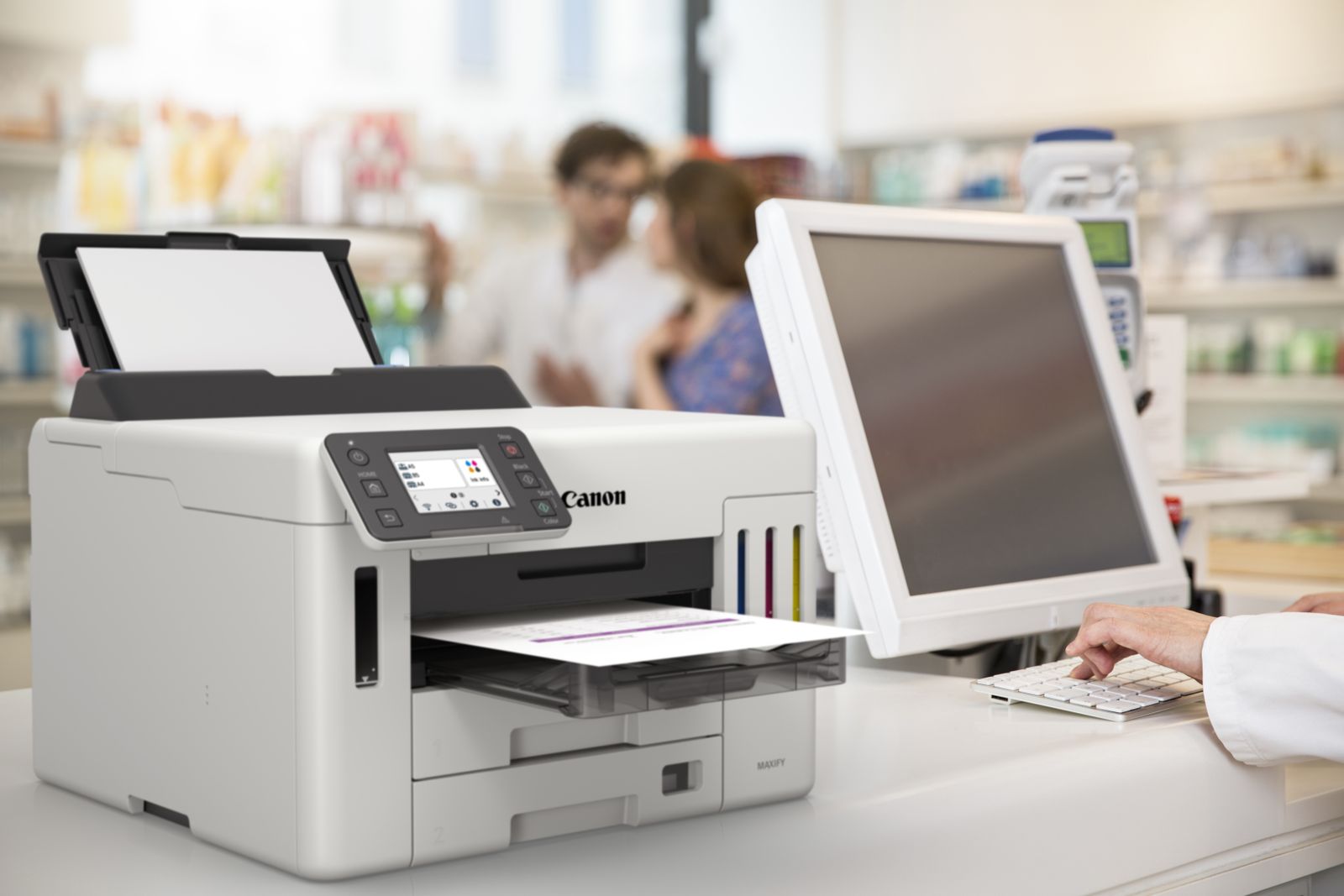Canon MAXIFY GX5550. A colori, Numero di cartucce di stampa: 4, Ciclo massimo di funzionamento: 45000 pagine per mese. Risoluzione massima: 600 x 1200 DPI. Massimo formato carta serie ISO A: A4. Stampa fronte/retro. Tipologia display: LCD. Wi-Fi. Colore del prodotto: Nero, Bianco