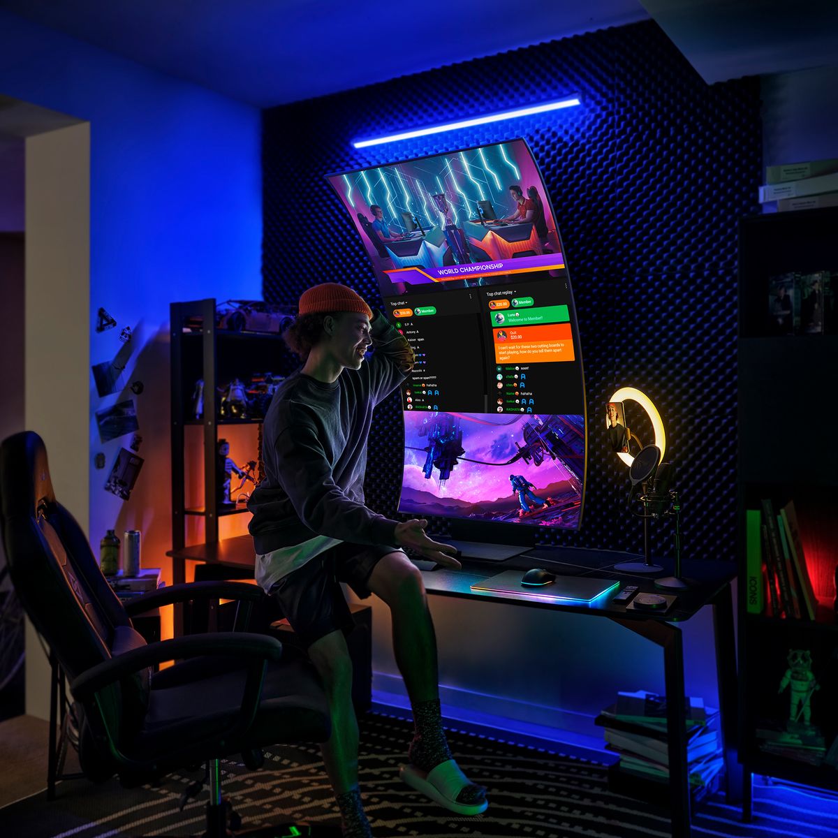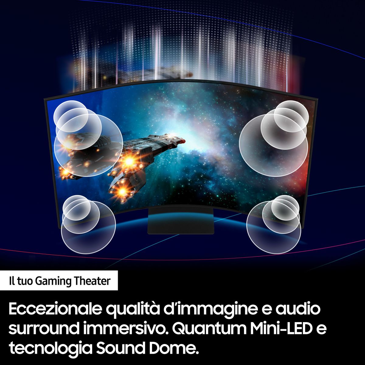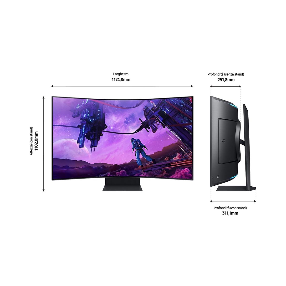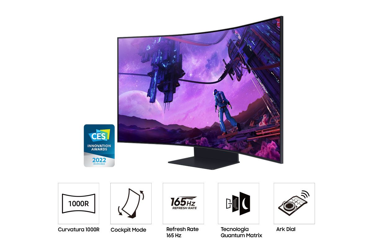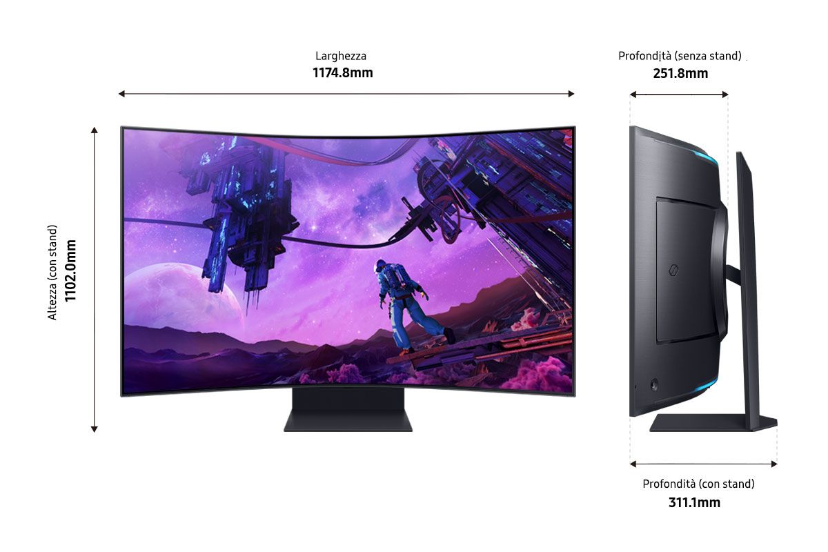 Samsung Monitor Gaming Odyssey Ark - G97NB da 55" UHD Curvo. Dimensioni schermo: 139,7 cm (55"), Risoluzione del display: 3840 x 2160 Pixel, Tipologia HD: 4K Ultra HD, Tempo di risposta: 1 ms, Rapporto d'aspetto nativo: 16:9, Angolo di visualizzazione (orizzontale): 178°, Angolo di visualizzazione (verticale): 178°. Altoparlanti incorporati. Hub USB integrato, Versione dell'hub USB: 2.0. Regolazione altezza. Colore del prodotto: Nero