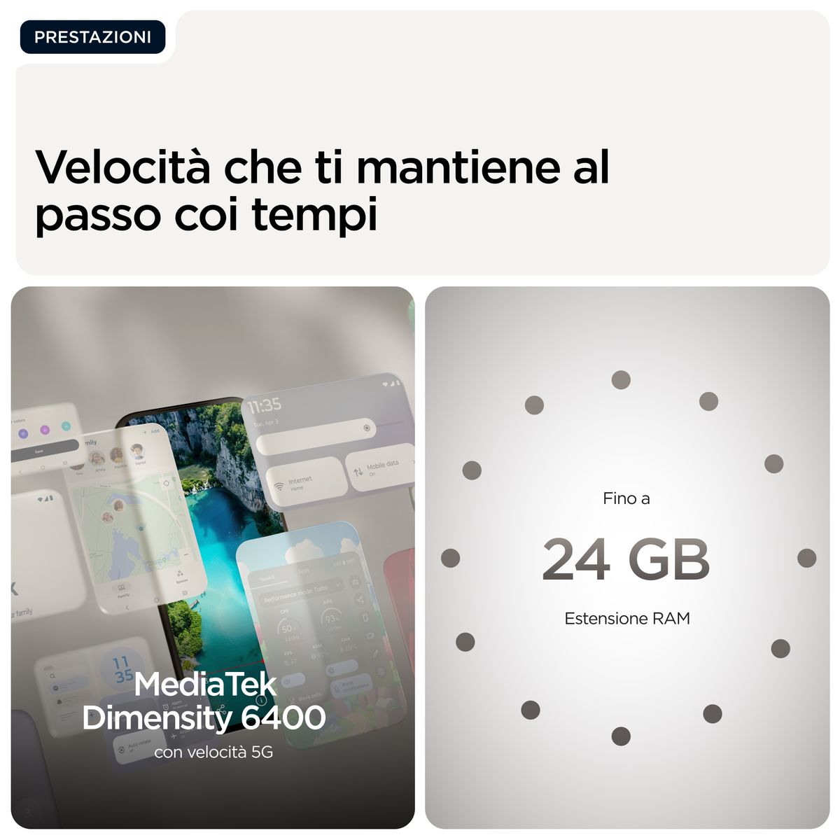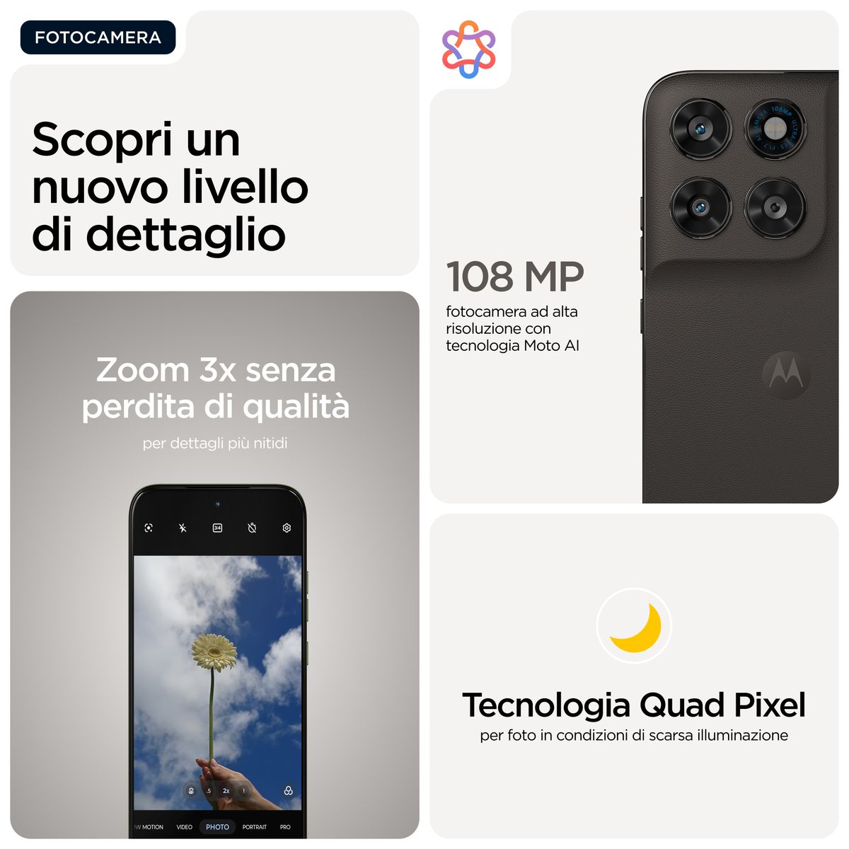 Motorola moto g77 . Dimensioni diagonale schermo: 17,3 cm (6.8"), Risoluzione del display: 1272 x 2772 Pixel. Frequenza del processore: 2,5 GHz, Famiglia processore: MediaTek Dimensity, Modello del processore: 6400. Capacità della RAM: 8 GB, Capacità memoria interna: 256 GB. Risoluzione fotocamera posteriore (numerico): 108 MP, Tipo di fotocamera posteriore: Doppia fotocamera. Capacità della scheda SIM: Dual SIM ibrida. Sistema operativo incluso: Android 16.0. Capacità della batteria: 5200 mAh. Colore del prodotto: Nero. Peso: 179 g