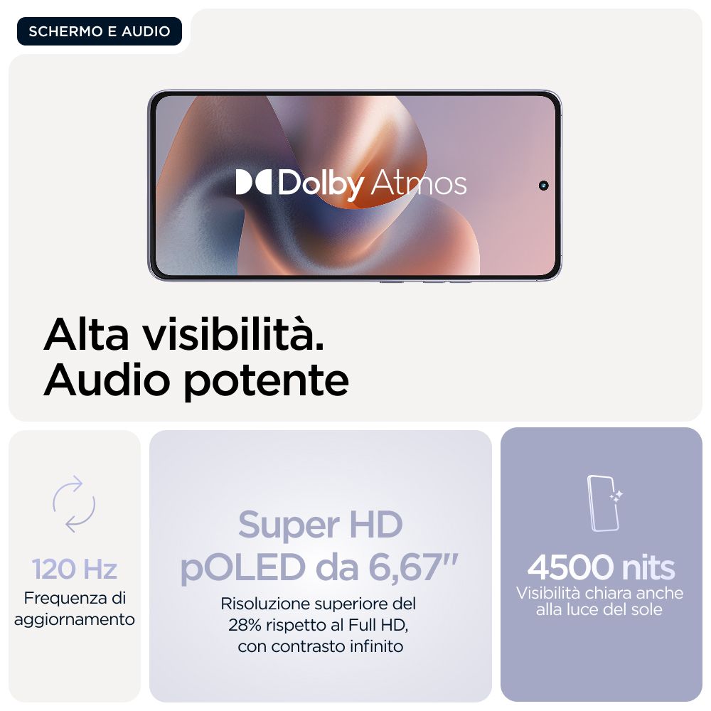 Motorola moto g86 5G . Dimensioni diagonale schermo: 16,9 cm (6.67"), Risoluzione del display: 2712 x 1220 Pixel. Famiglia processore: MediaTek Dimensity, Modello del processore: 7300. Capacità della RAM: 8 GB, Capacità memoria interna: 256 GB. Risoluzione fotocamera posteriore (numerico): 50 MP, Tipo di fotocamera posteriore: Doppia fotocamera. Capacità della scheda SIM: Doppia SIM. Sistema operativo incluso: Android 15. Capacità della batteria: 5200 mAh. Colore del prodotto: Lillà. Peso: 185 g