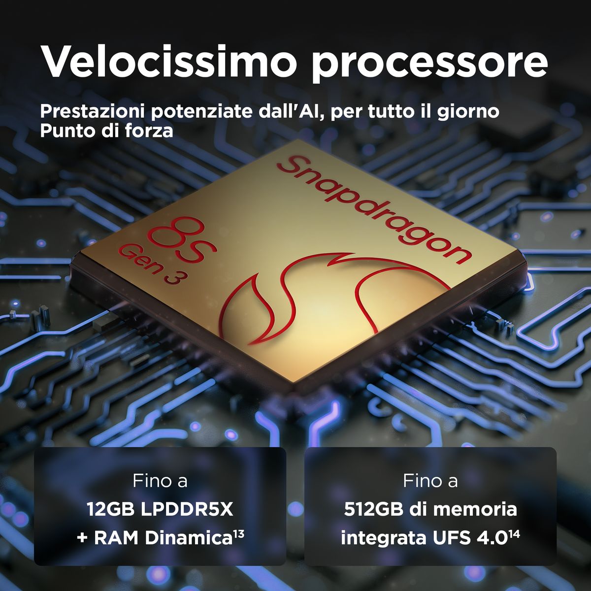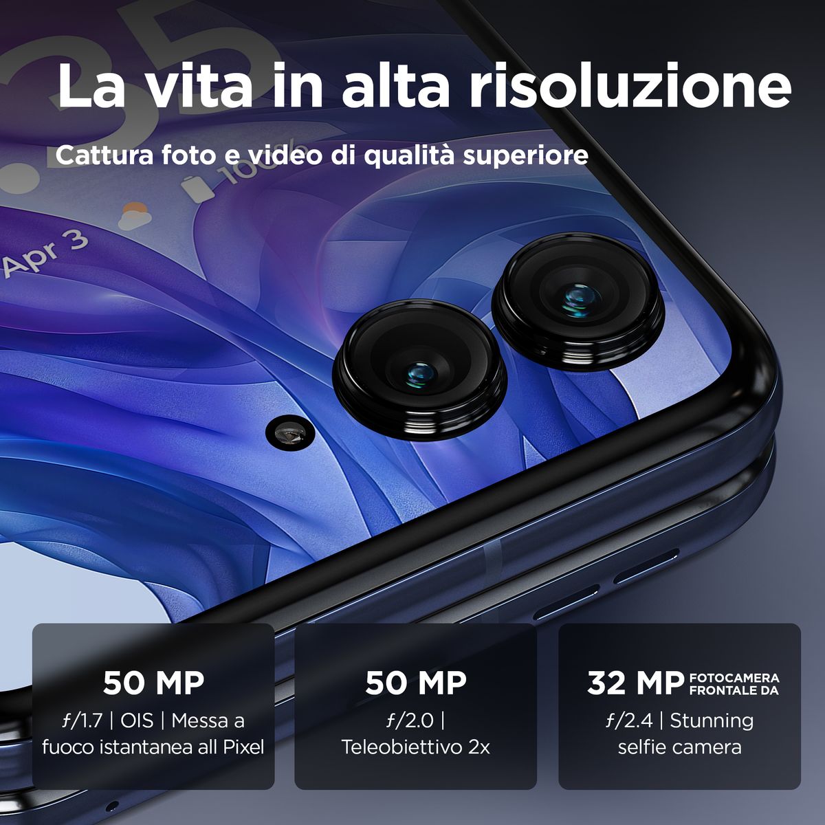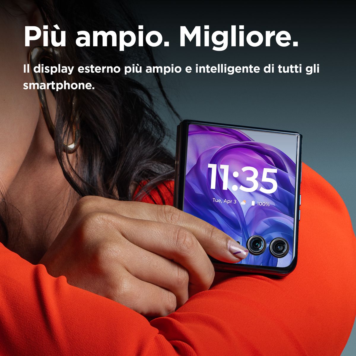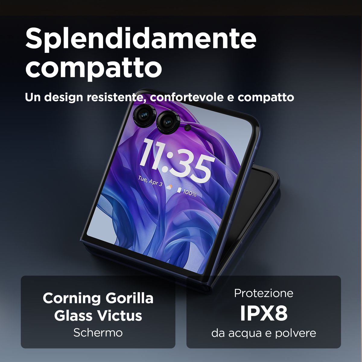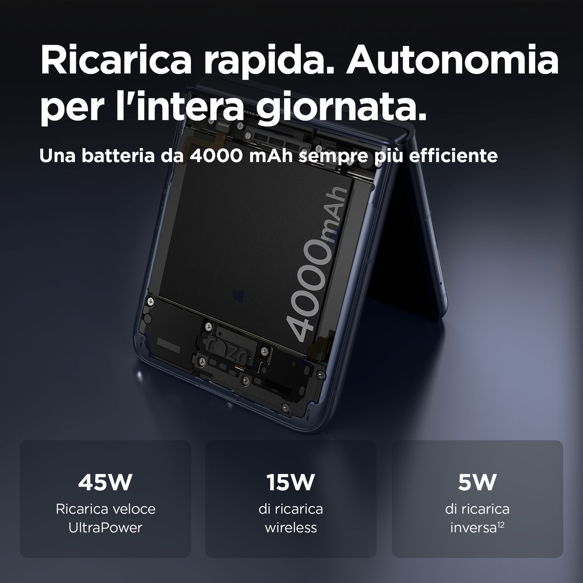 Motorola razr 50 Ultra. Dimensioni diagonale schermo: 17,5 cm (6.9"), Risoluzione del display: 2640 x 1080 Pixel. Famiglia processore: Qualcomm Snapdragon, Modello del processore: 8s Gen 3. Capacità della RAM: 12 GB, Tipo di RAM: LPDDR5X, Capacità memoria interna: 512 GB. Risoluzione fotocamera posteriore (numerico): 50 MP, Tipo di fotocamera posteriore: Doppia fotocamera. Capacità della scheda SIM: Doppia SIM. Sistema operativo incluso: Android 14. Capacità della batteria: 4000 mAh. Colore del prodotto: Blu marino. Peso: 189 g