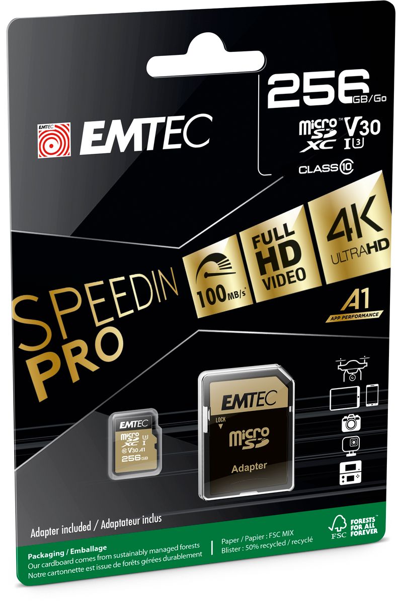 Emtec SpeedIN Pro. Capacità: 256 GB, Tipo flash card: MicroSDXC, Classe di memoria flash: Classe 10, Tipo di RAM: UHS-I, Velocità di lettura: 100 MB/s, Velocità di scrittura: 95 MB/s, Classe di velocità UHS: Class 3 (U3), Classe di velocità video: V30. Colore del prodotto: Marrone
