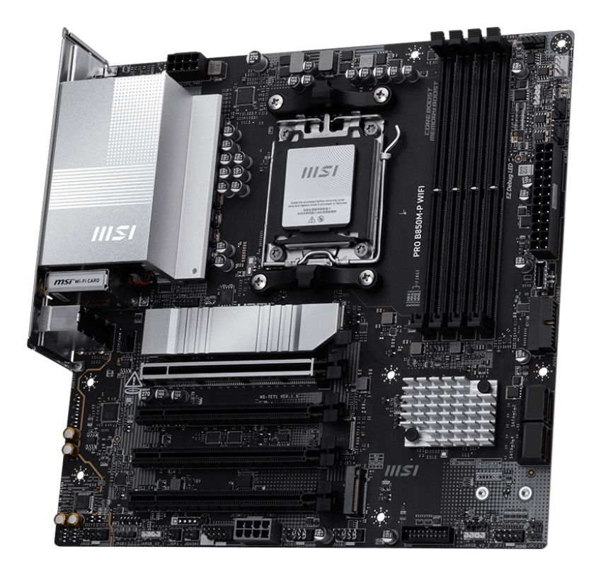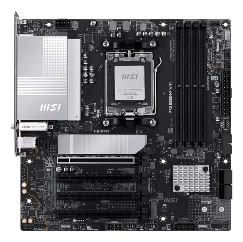 MSI PRO B850M-P WIFI. Produttore processore: AMD, Presa per processore: Socket AM5, Processori compatibili: AMD Ryzen 7000 Series, AMD Ryzen 8000 Series, AMD Ryzen 9000 Series. Tipi di memoria supportati: DDR5-SDRAM, RAM massima supportata: 256 GB, tipo di slot di memoria: DIMM. Interfacce dell'unità di archiviazione supportate: M.2, Tipi di unità di archiviazione supportate: HDD & SSD, Livelli RAID: 0, 1, 10. Tipo di interfaccia Ethernet: 5 Gigabit Ethernet, Wi-Fi standard: Wi-Fi 7 (802.11be), Standard Wi-Fi: 802.11a, 802.11b, 802.11g, Wi-Fi 4 (802.11n), Wi-Fi 5 (802.11ac), Wi-Fi 6 (802.11ax), Wi-Fi 6E.... Componente per: PC, Fattore di forma scheda madre: micro ATX, Famiglia di chipset per scheda madre: AMD