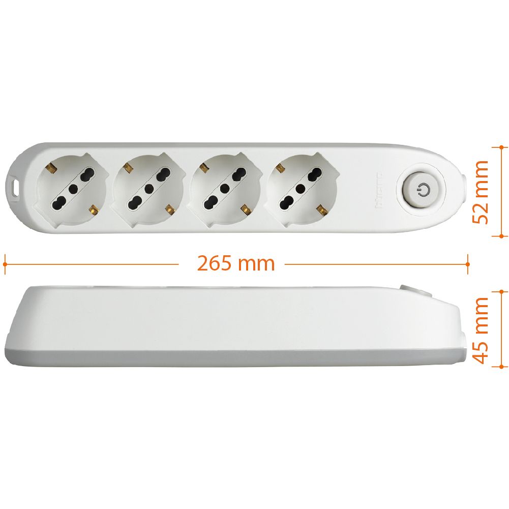 bticino Poker. Lunghezza cavo: 1,5 m, Posizionamento supportato: Interno, Fattore di forma della spina di alimentazione: Ad angolo. Quantità prese AC: 4 presa(e) AC. Tensione di ingresso AC: 250 V, Corrente massima: 16 A. Larghezza: 290 mm, Profondità: 52 mm, Altezza: 45 mm. Numero di prodotti inclusi: 1 pz